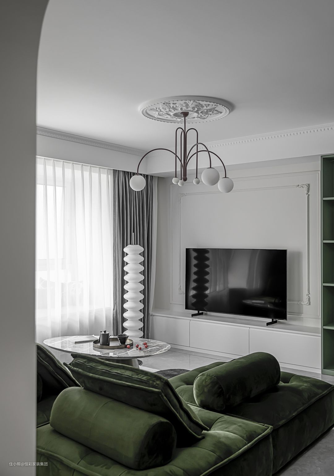 大面积白色主背景色简约清爽,配色墨绿色主沙发,简约高级。搭配一盏纯白色糖葫芦落地灯,更有设计感。