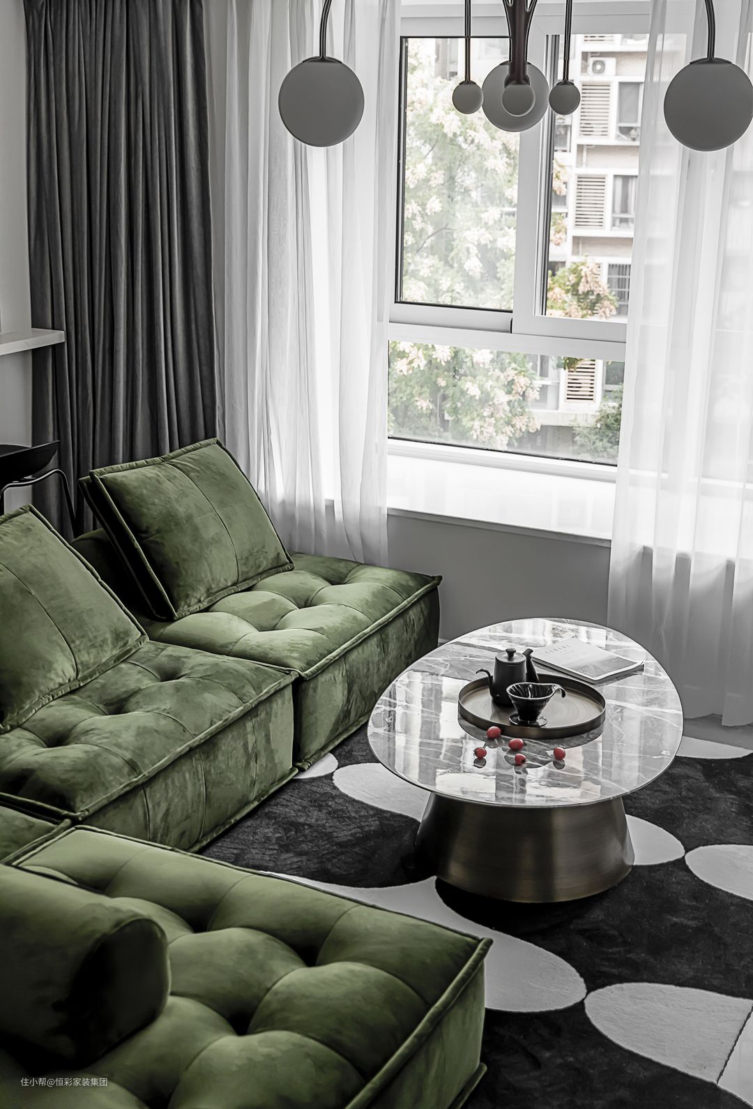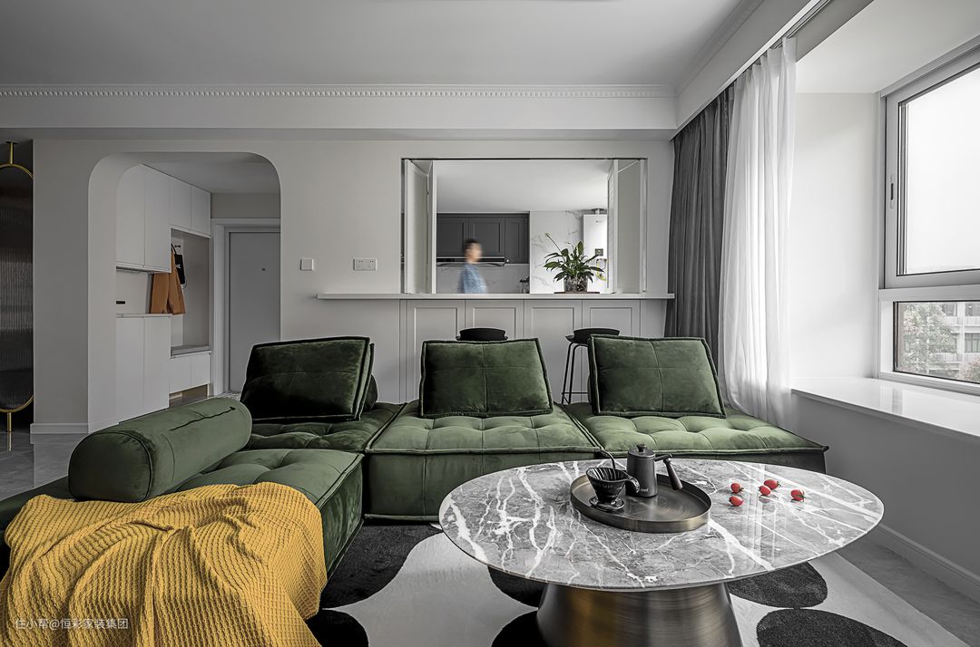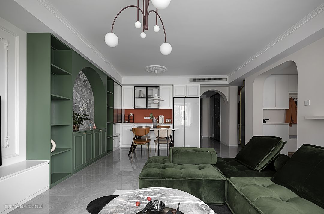 另一边靠墙定制电视机柜,不留柜脚的设计让空间更加简单清爽。电视机柜延伸处是餐边柜,选择与沙发同样的墨绿色搭配,整个空间的配色更加完整、统一。