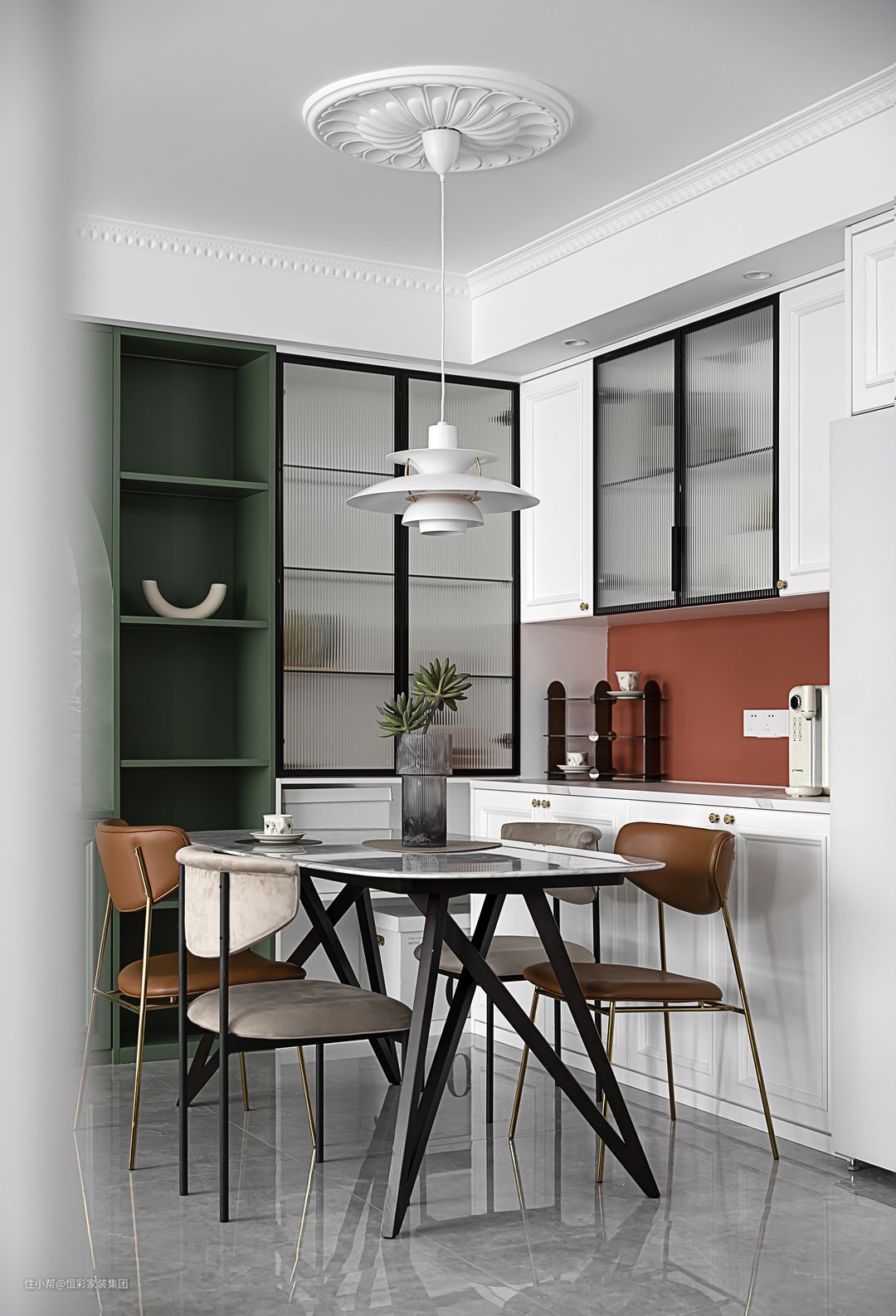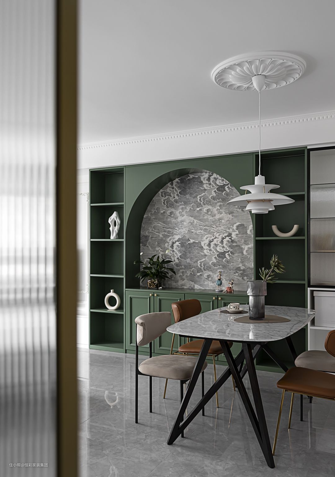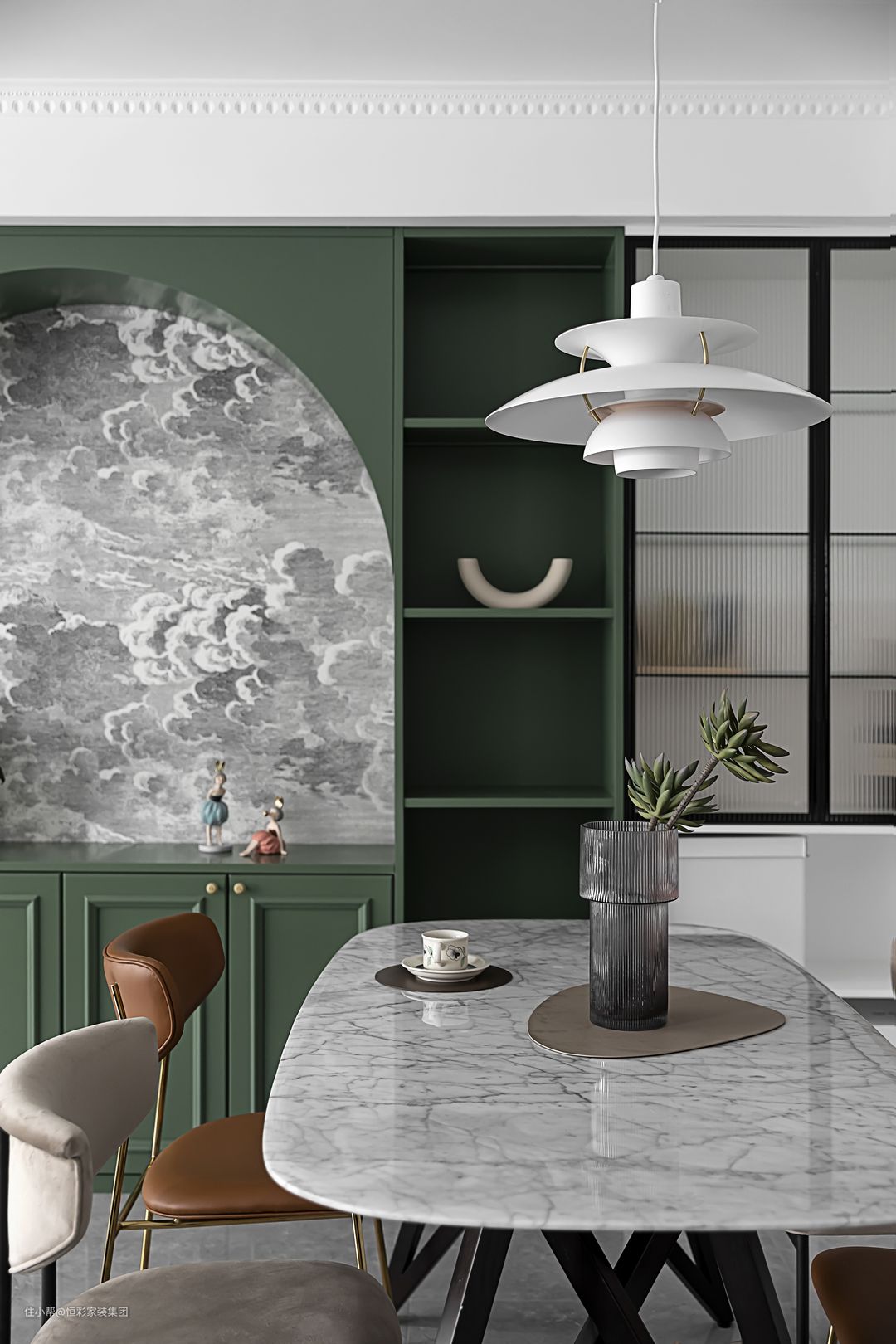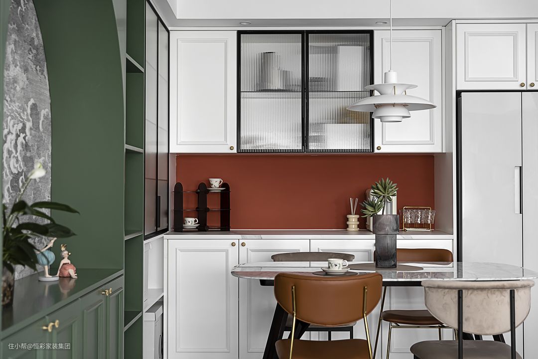 改造后在餐厅位置的两面墙上增加了两组餐边储物柜,选择饱和度稍低的墨绿色和相对明艳的土橙色局部装饰做一个跳色处理,在视觉上产生了极大的冲击感,可谓一场激烈的视觉盛宴。