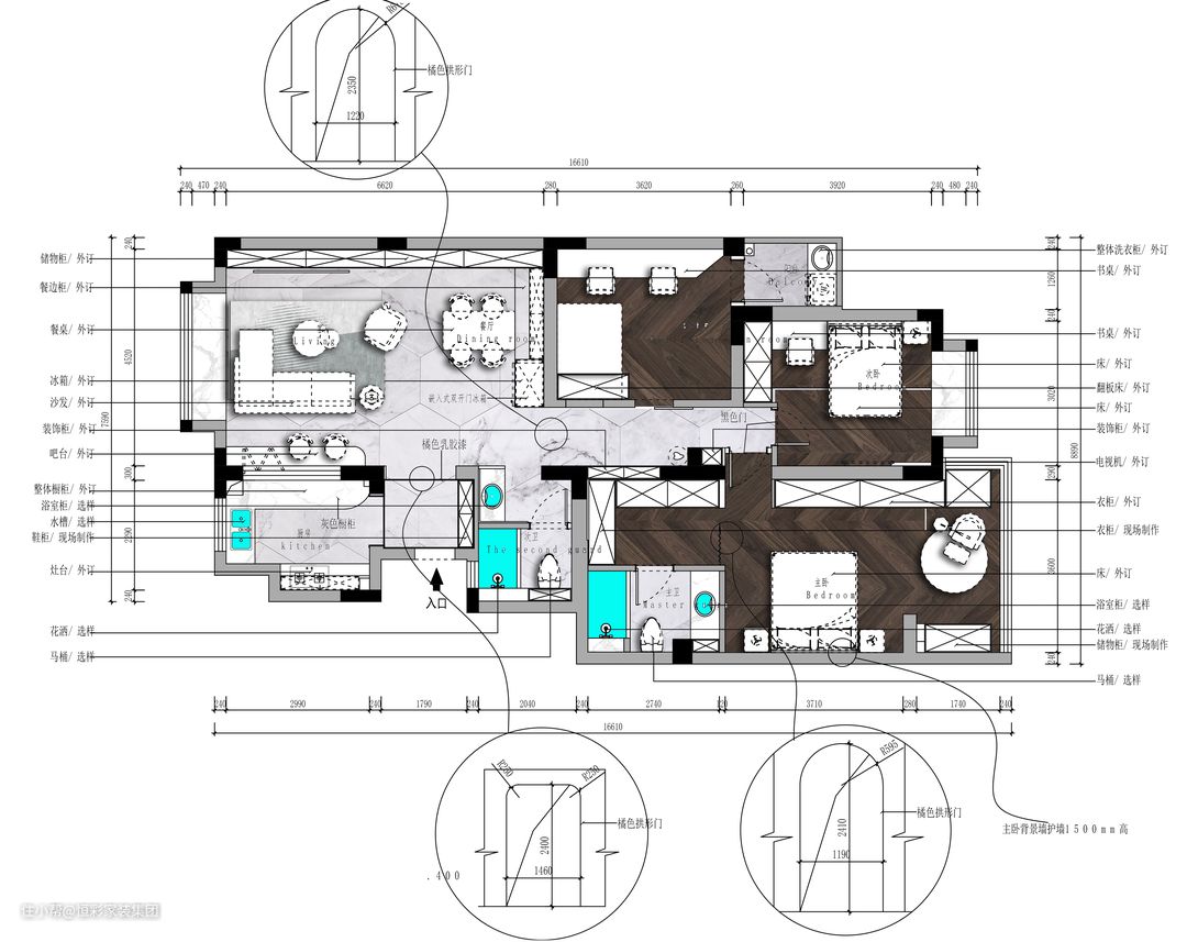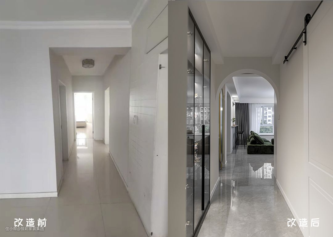 设计改造: 1.玄关门厅、过道都采用了拱门设计,为空间过度增加了法式风格的仪式感; 2.原户型中厨房空间相对闭塞,改造后将厨房门拓宽,增加空间视觉感。厨房与客厅之间的隔断墙敲掉一半,做了一个空间的延伸设计,吧台过度空间增加了更多的可能性; 3.三个卧室的房门位置稍作调整,主卧原房门位置封掉,改成一个L型走入式衣帽间,卫生间往房间的位置拓宽了一点,做三区并行设计,衣帽间到房间直接做了一个拱门设计,颜值get,仪式感满满; 4.客卫做干湿分离处理,长虹玻璃隔断保护主人隐私,又不妨碍采光。