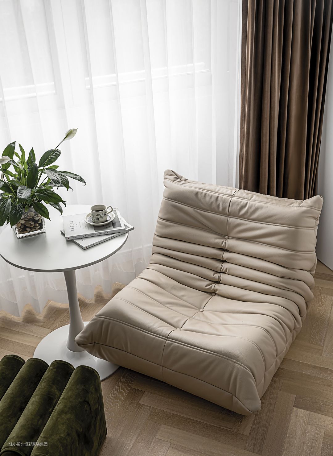 改造后抛弃传统靠墙沙发,L型自带靠背贴地组合沙发环抱圆形小茶几,利用相对深的深度和相对低的高度,营造了一种视觉上慵懒舒适的体验感,让空间相对饱满,同时也在视觉上起到拉高层高的作用。