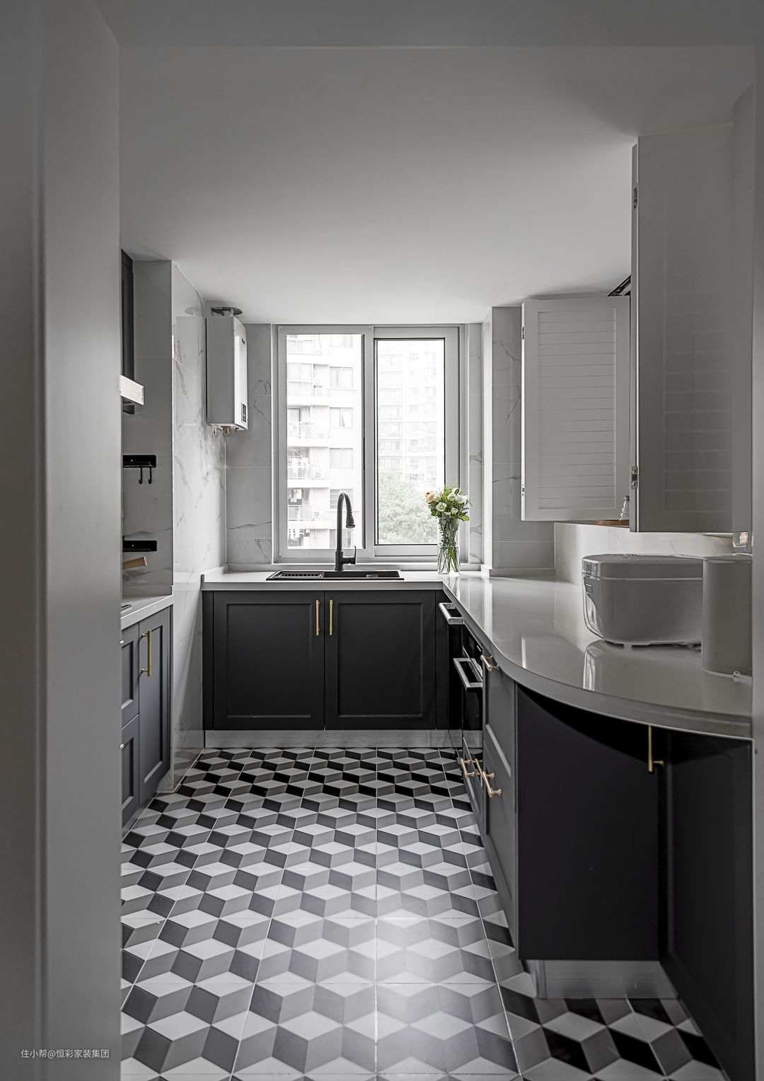 厨房地面采用立体几何花砖铺贴,把视觉重心放在地上。考虑到了油烟问题,在吧台上增加了一个折叠窗户,有需要时关上,不需要时打开就是一个很棒的吧台休闲区。