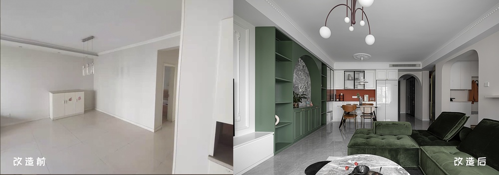 改造前后餐厅位置不变,通过改变两组餐边柜的设计,让整个餐厅空间瞬间成为整个案子里最吸睛的空间。