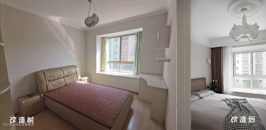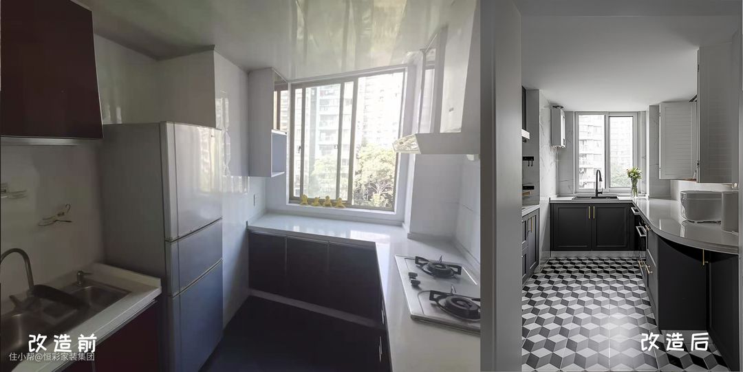 改造前冰箱放在厨房,空间拥挤不美观。水池放在进门后的位置,采光不好。 改造后将冰箱从厨房移出,放在餐厅里。水池也改到了靠窗位置,既能改善采光,通风效果也更好,可以充分保证厨房水池区的干燥,不论是从美观还是生活居家上来说,都更科学合理。