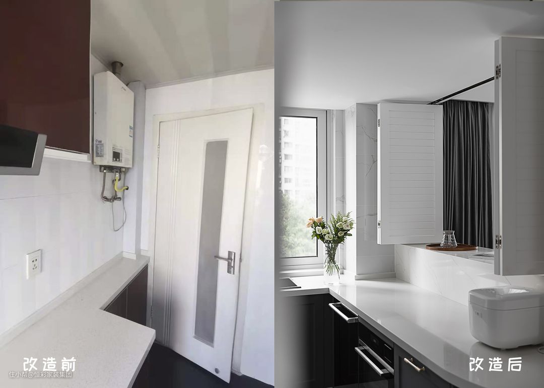 改造前厨房台面因为厨房门的限制性不能做满,做了一个异形过度收尾,安全性不高,容易磕碰到。 改造后直接舍弃厨房门隔断,厨房台面以弧形收尾,更加美观、安全。
