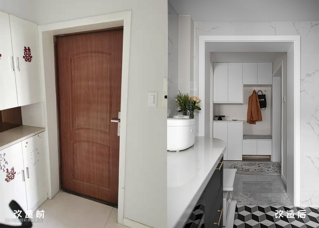 玄关保留原始格局,唯一不同的是将原本中间镂空的传统玄关柜改为具备挂衣区和换鞋凳一体设计的柜体,更加实用。