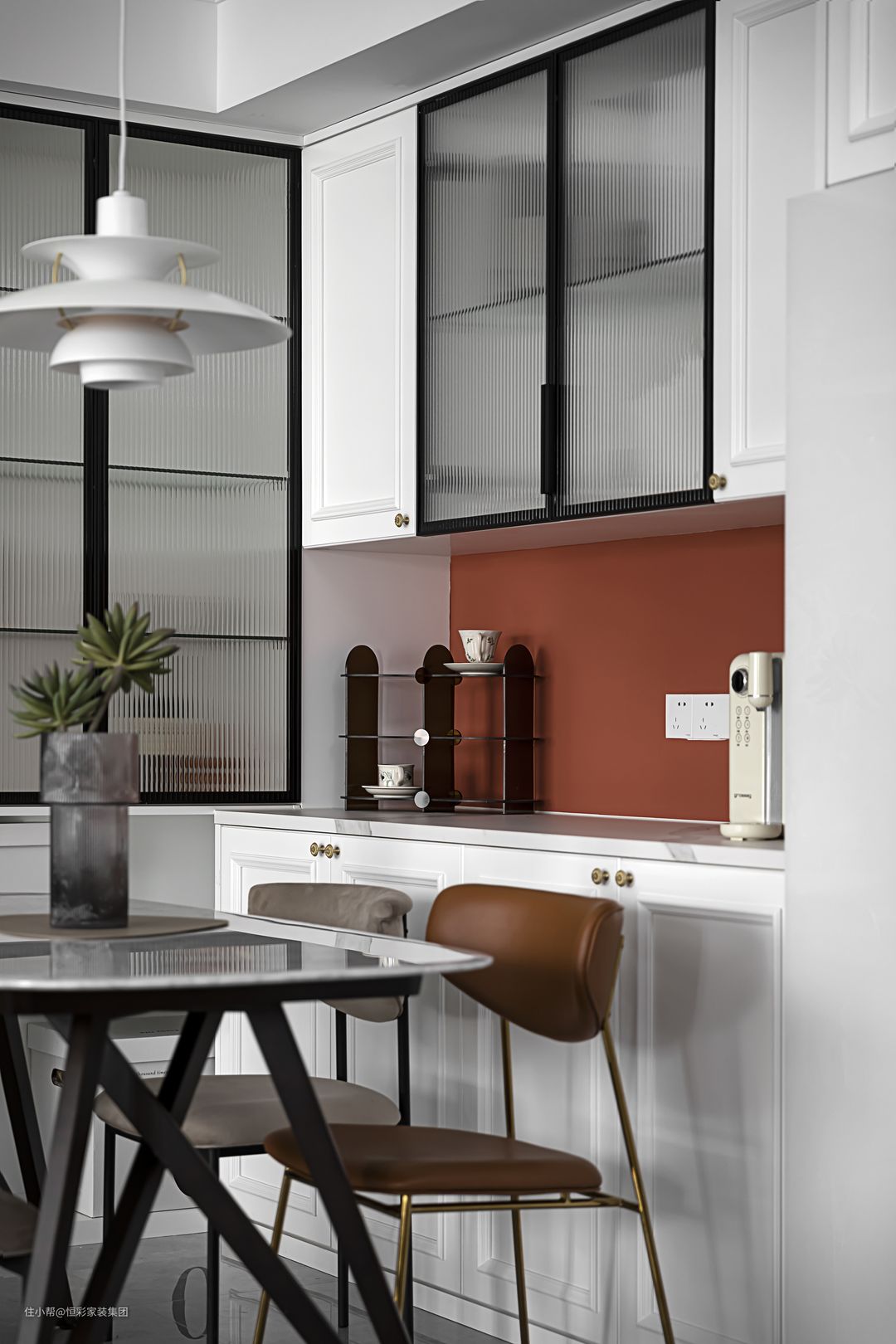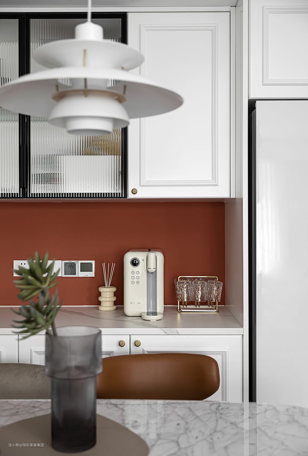 白色餐边柜上下柜设计,中间镂空装上插座,也是一个非常实用的设计小skill。土橙色装饰镂空位置,形成强烈的色彩对比,避免空间过于“素”。除了白色木柜门以外,也保留了一些长虹玻璃柜门的设计,在设计感和实用性上都值得推荐。