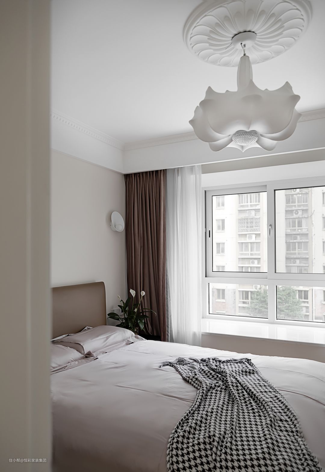 飘窗保留,窗帘家具选择简单素雅的咖色作为房间的主角色。咖色遮光窗帘搭配白纱,圆形石膏造型吊灯灯座搭配蚕丝经典异性吊灯,经典耐看。