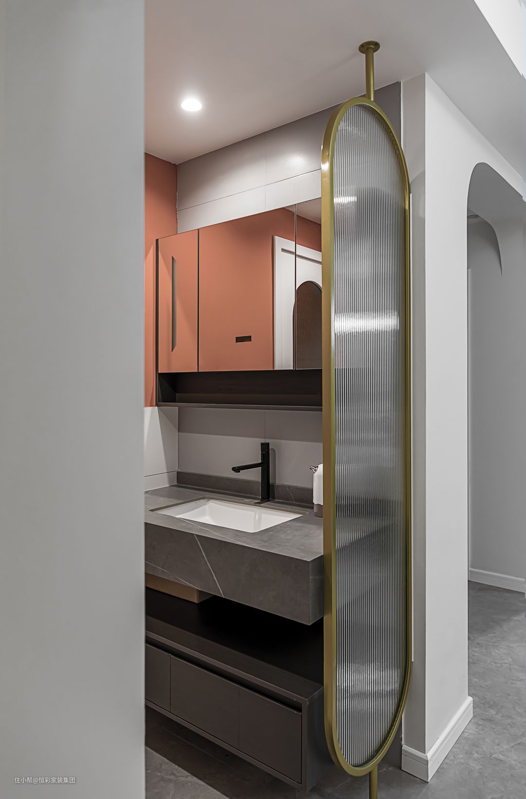 长虹玻璃隔断保护主人隐私,又不妨碍采光。橙色的台盆上柜用色大胆,搭配镜柜、筒灯设计,更具氛围感。大理石台面搭配浅灰色悬空下柜,高级感满满。台下盆设计,更有利于清洁。