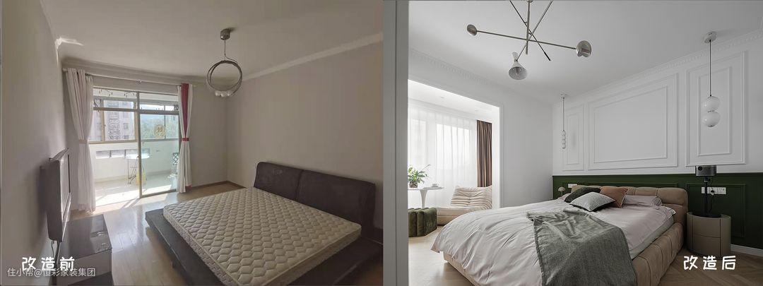 改造后将原房门位置封掉,改成一个L型走入式衣帽间,卫生间往房间的位置拓宽了一点,做三区并行设计,衣帽间到房间直接做了一个拱门设计,颜值get,仪式感满满。
