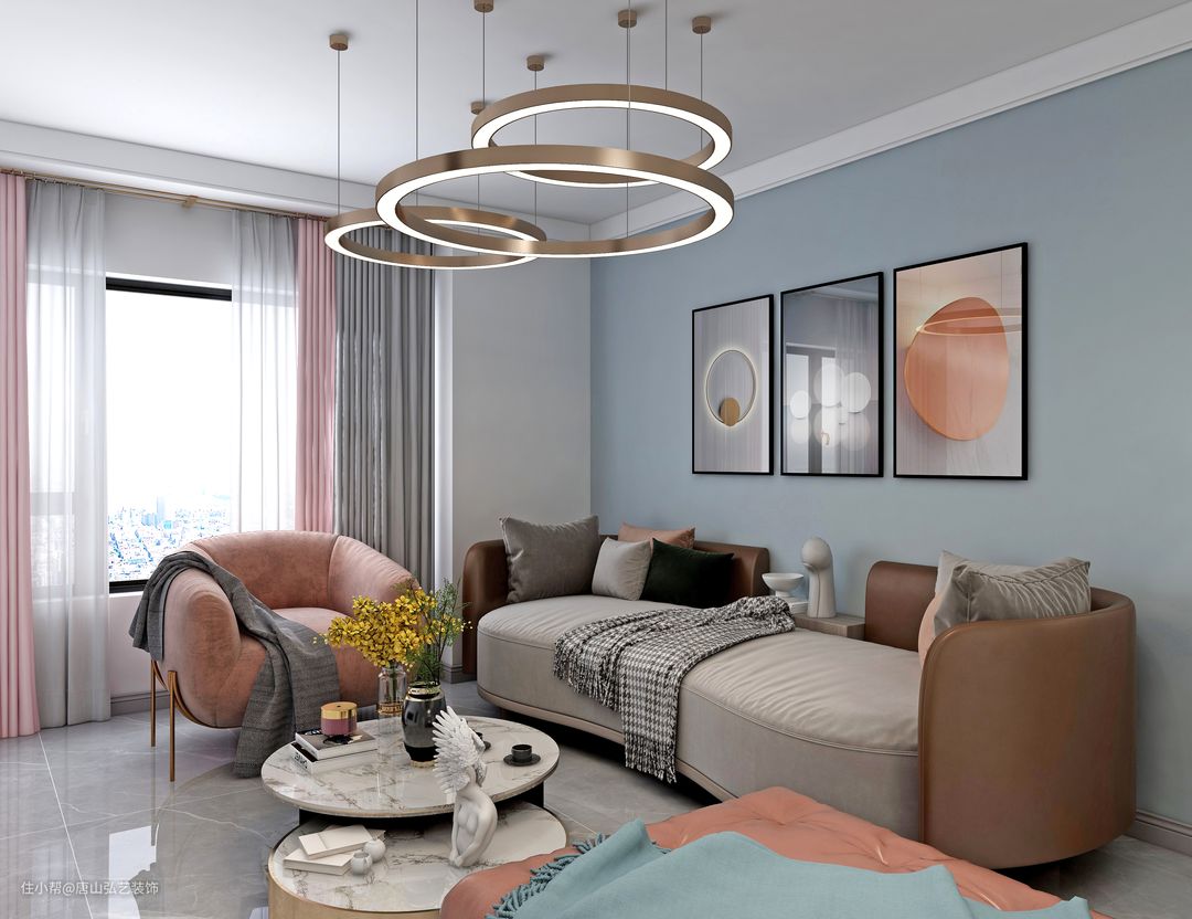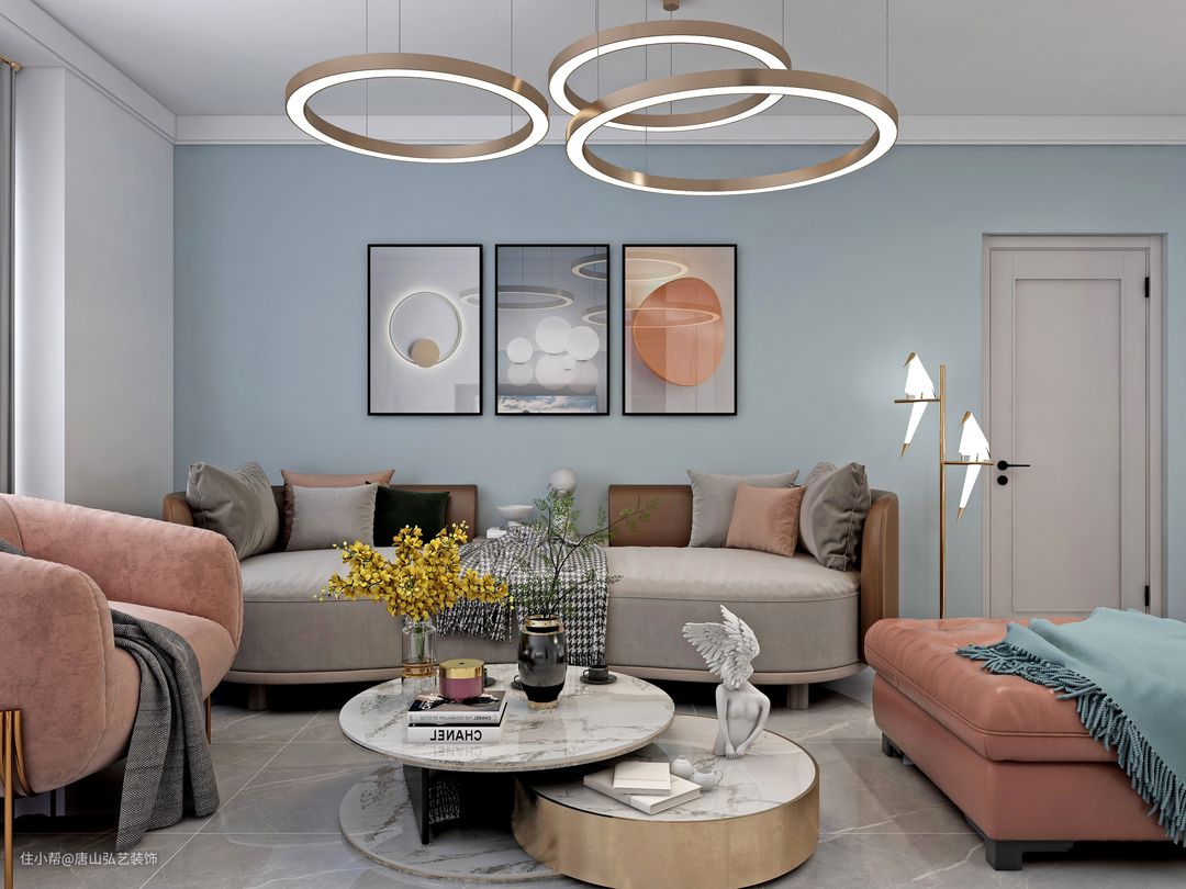 沙发选用三加一的沙发配比,背景简约处理,在背景上通过颜色区分来分出层次,再通过装饰挂画来点缀,钓鱼灯的辅助光源为了给沙发区域补光,制造整体氛围感