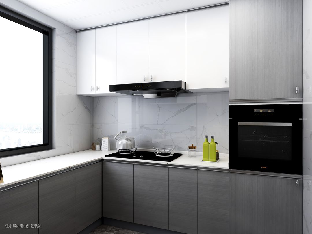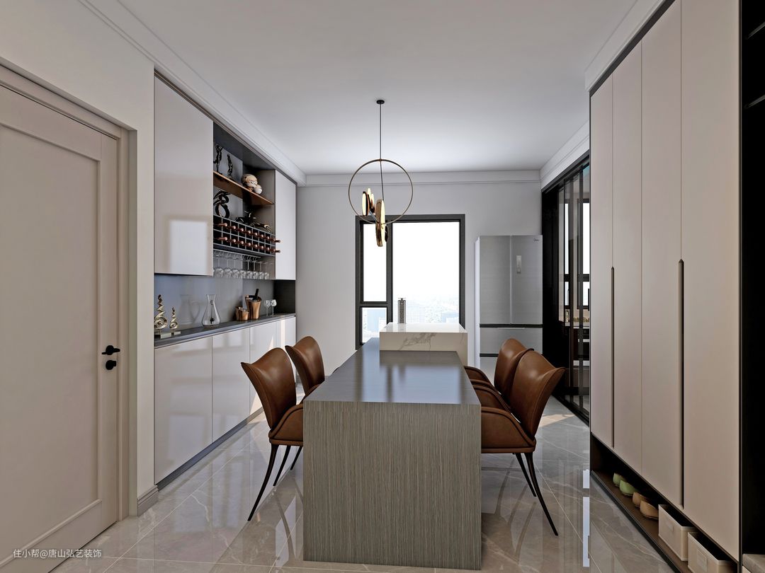 厨房空间相对较小,把冰箱放到了餐厅位置,在原本冰箱的位置设置了通高内嵌烤箱高柜,来增加储物性