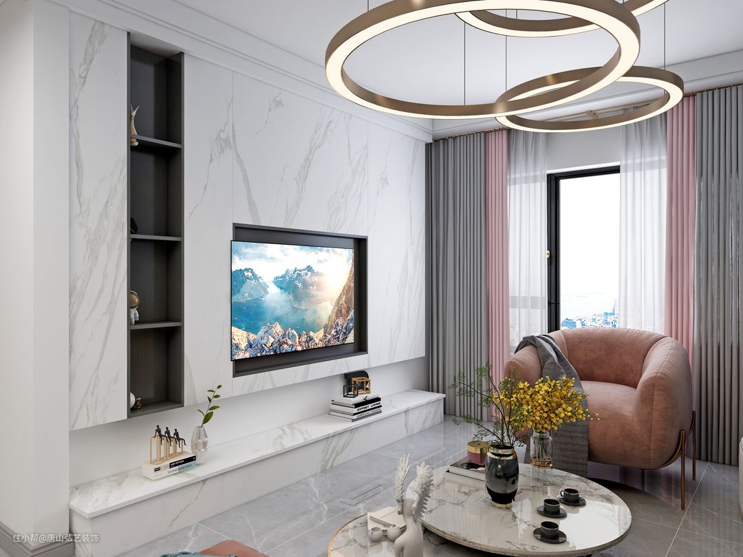 电视背景选择用岩板和内嵌储物柜的形式来表现,增加储物性的同时,为电视背景做出层次感