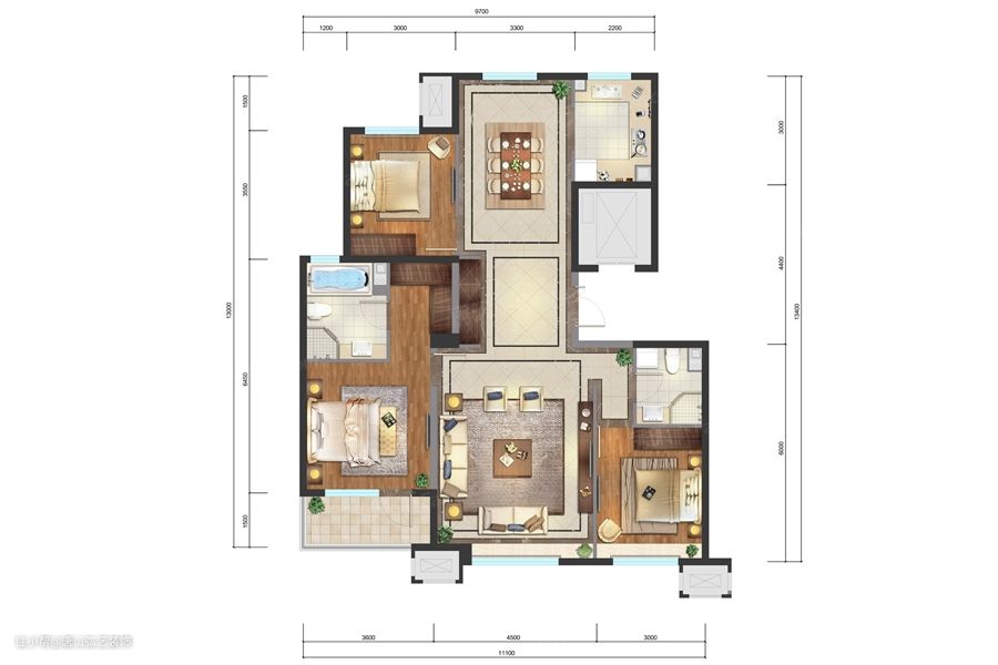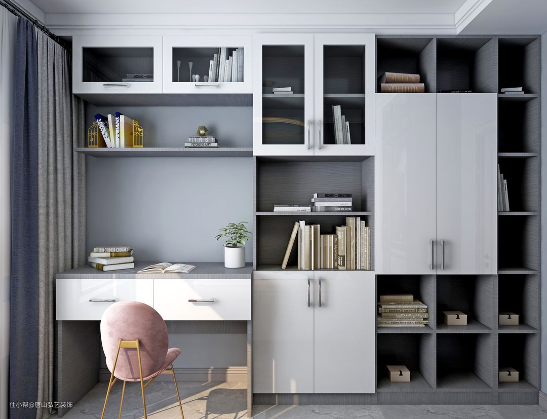效果图为次卧床尾位置,由于南北朝向尺寸受限,所以特意再东西方向做了扩建,利用扩建的空间做了一整面的书柜加书架,来实现小主人的学习空间