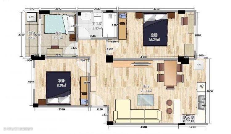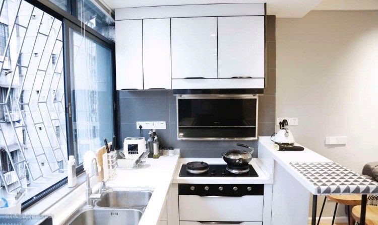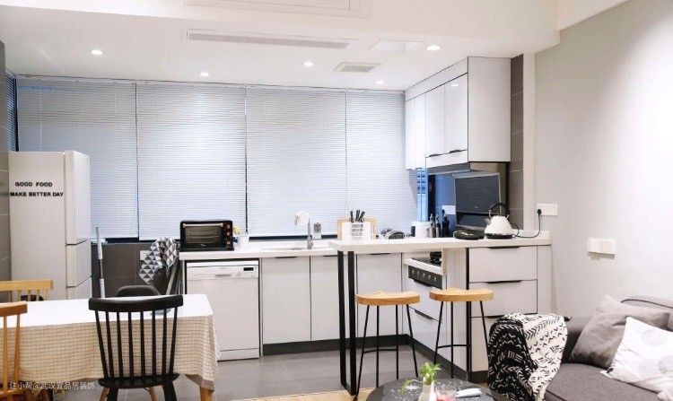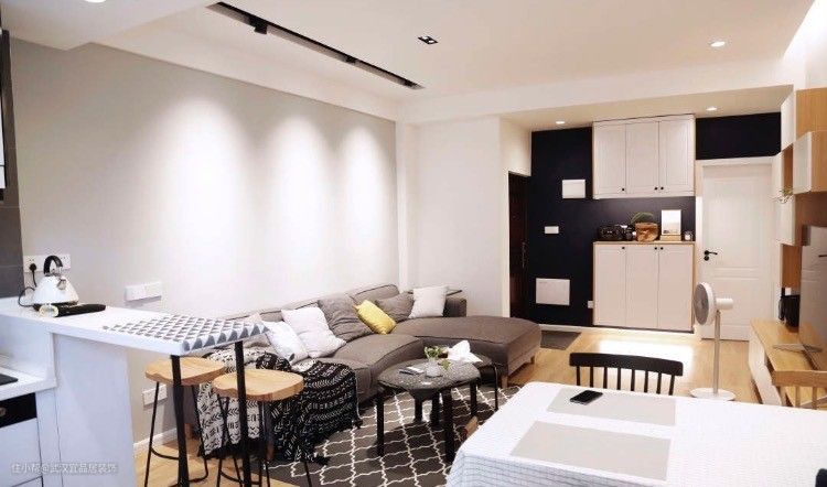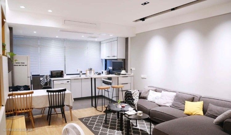 一进门就能一览无余,客餐厅是开放式的,简单清爽。墙面大面积的留白,搭配灰色的布艺沙发,让简约来得更直接。