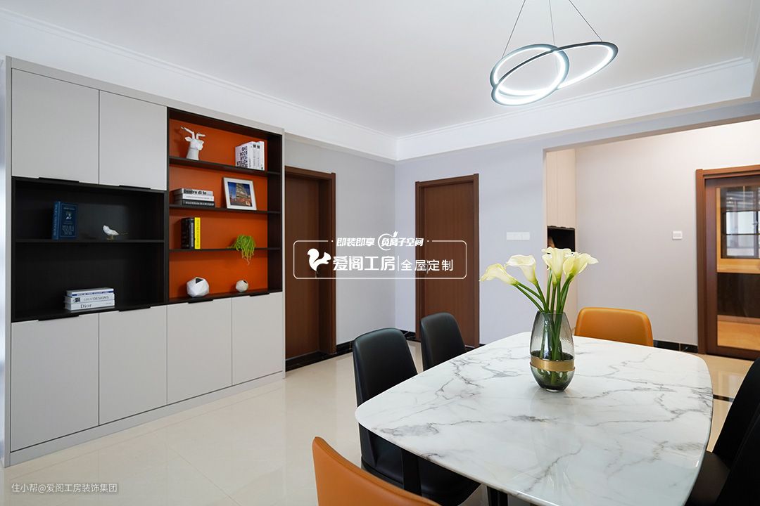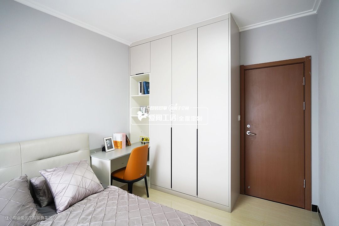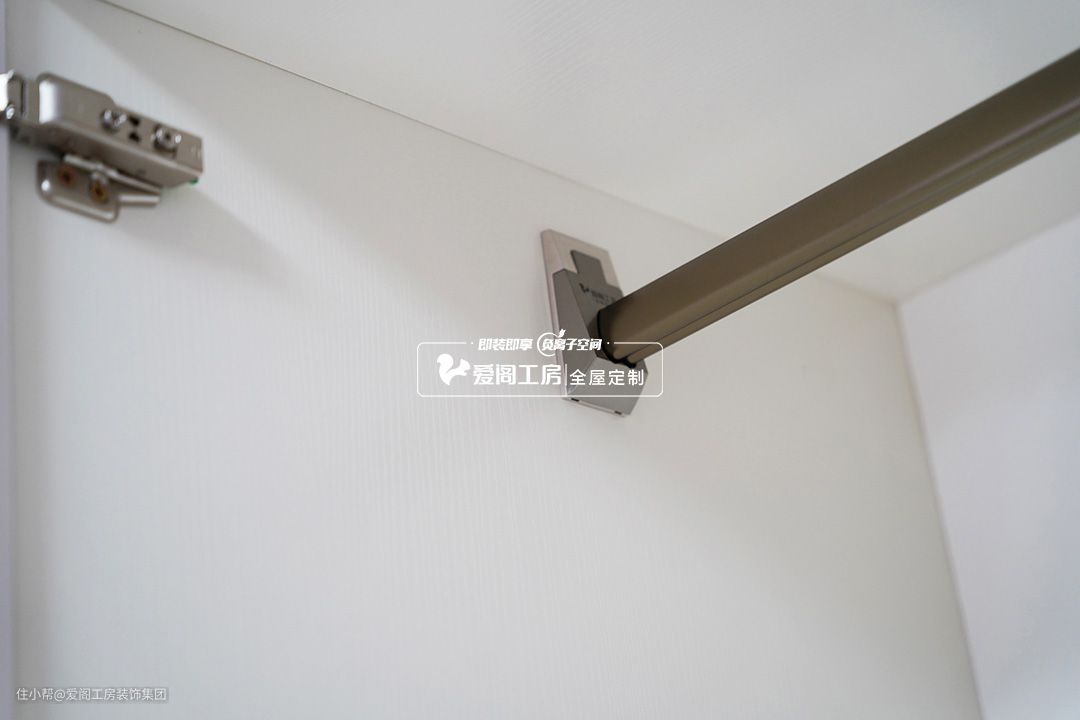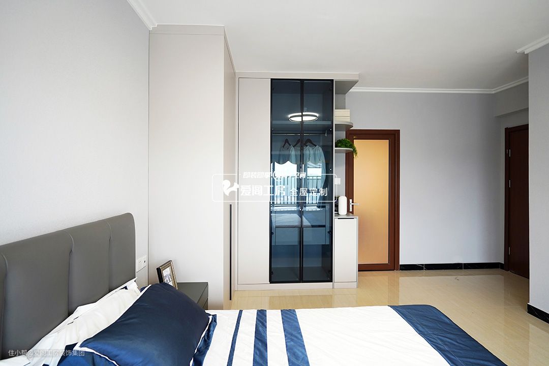 整体空间以低饱和度的“高冷”姿态,重塑匠心独特的艺术品格。尤其是转角衣柜的打造,颇有设计感,面向门的这边做了弧形开放格,方便业主收纳,不用全都收进柜里。