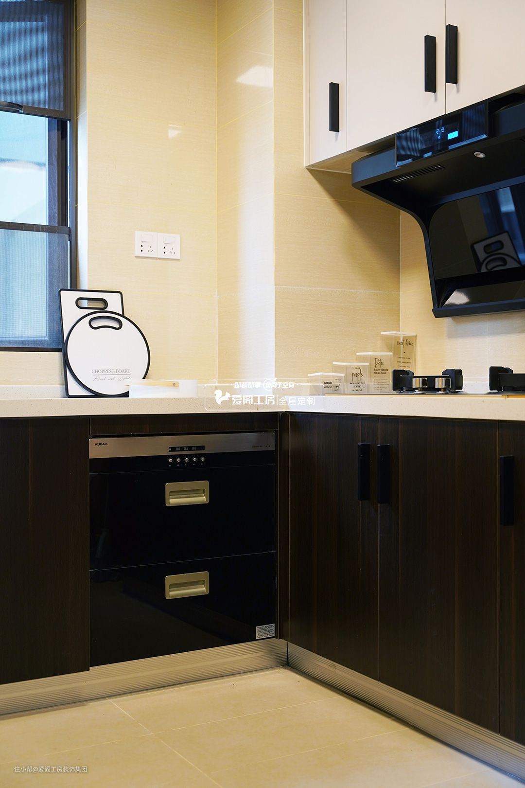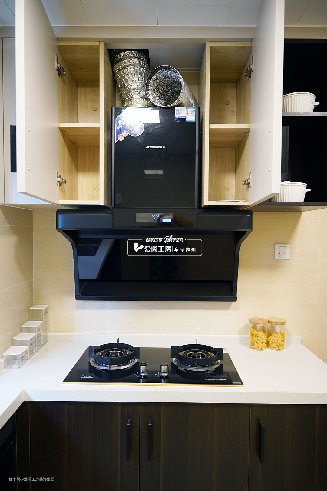 L型橱柜量尺度地,不浪费一点空间。利用吊柜将烟道藏起来,不影响美观,也能充分利用空间做收纳,让定制为生活品质加码。