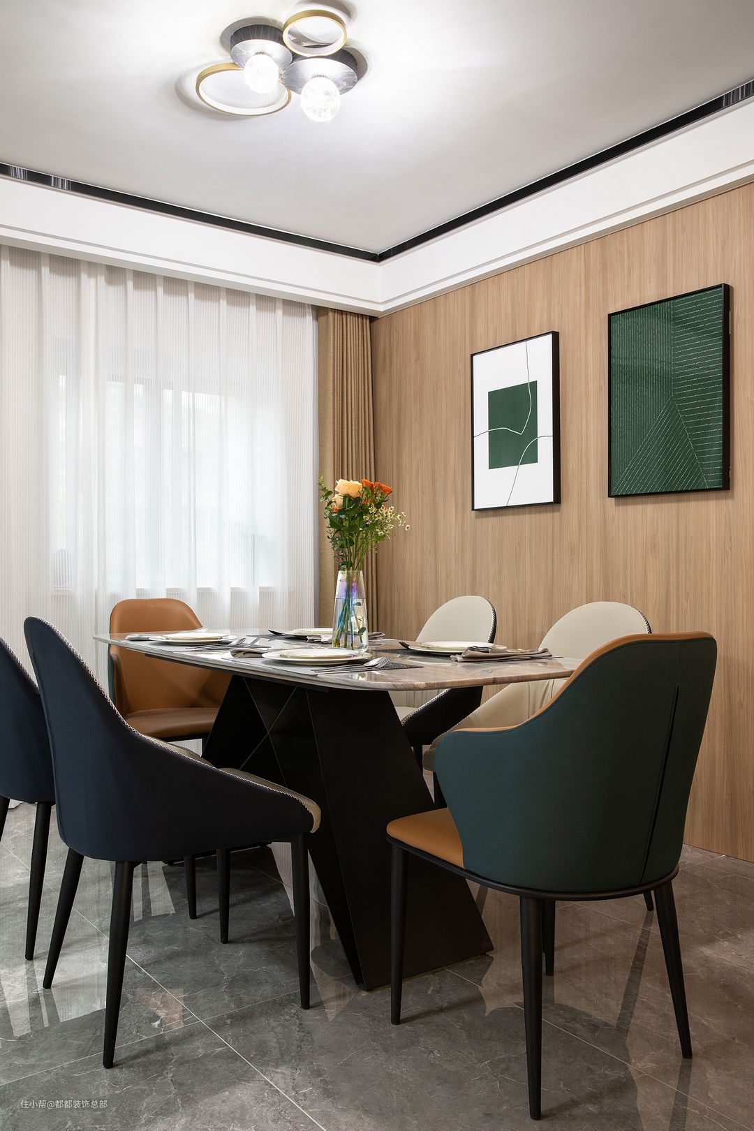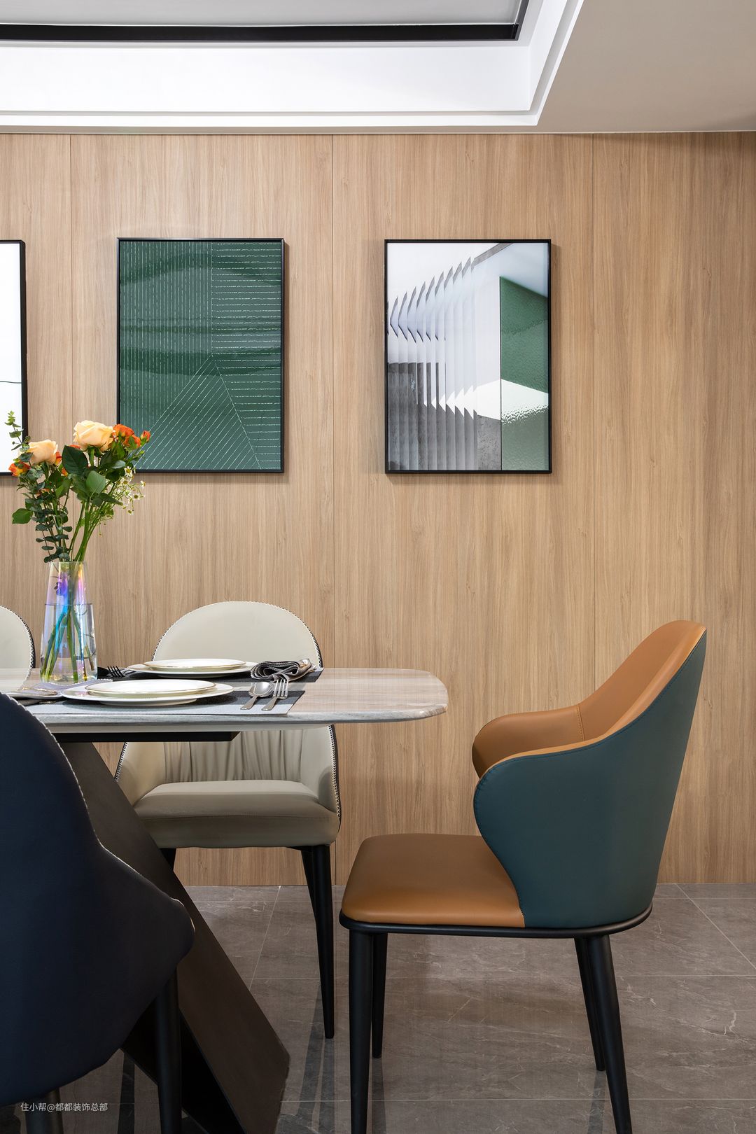 实木纹理柔和舒缓,带着漫长岁月的生命力,低饱和度的家具配色,清爽简洁,在这样的氛围中用餐仿佛置身于自然中,辛劳一天的身心得以解放。