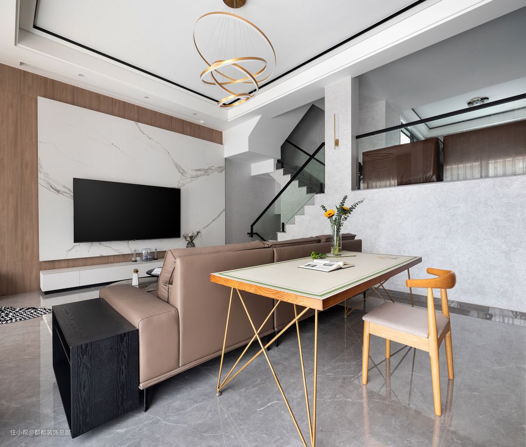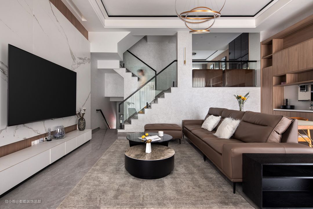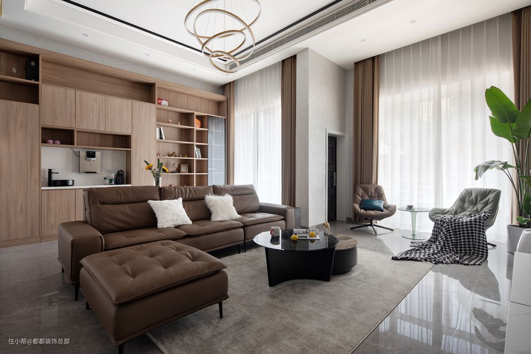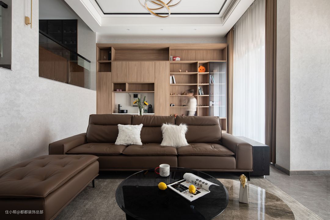 典雅、浪漫,摩登集合于一体,家具的选择大多为意大利品牌,皮质沙发轮廓明显,温暖柔软,配以温柔的獭兔毛保证,幸福的滋味由此而生。#你家客厅是怎么布局的?