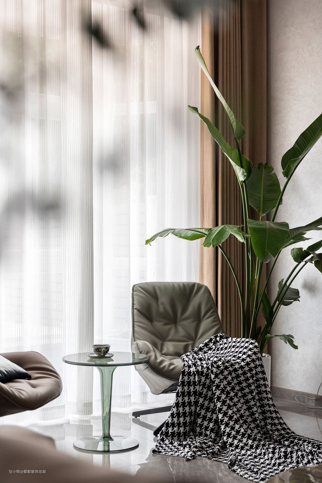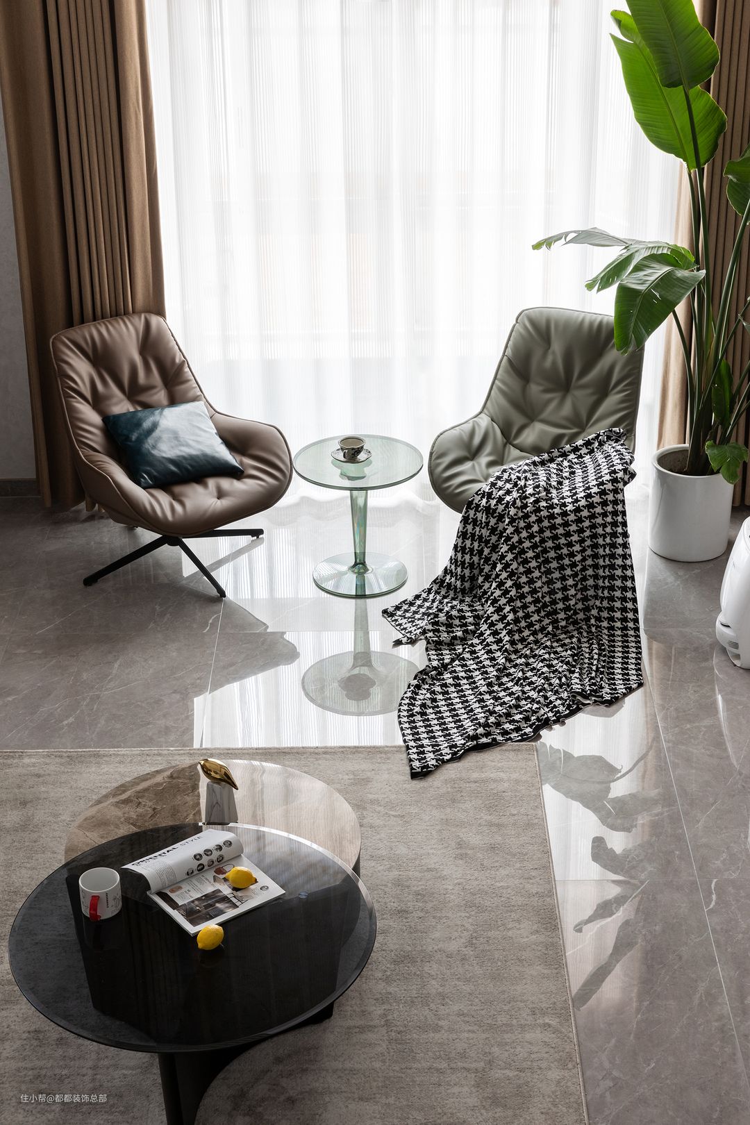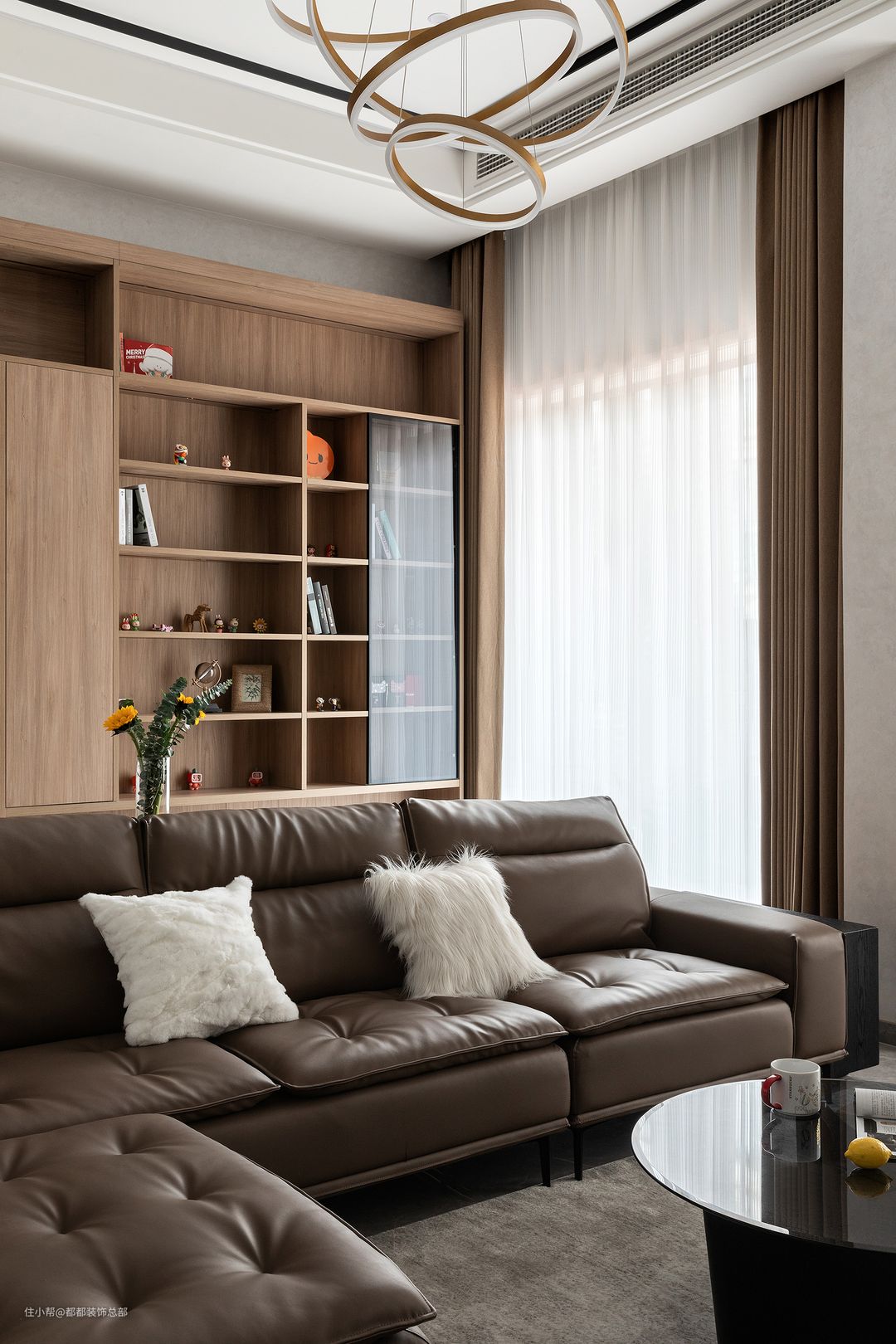典雅、浪漫,摩登集合于一体,家具的选择大多为意大利品牌,皮质沙发轮廓明显,温暖柔软,配以温柔的獭兔毛保证,幸福的滋味由此而生。#你家客厅是怎么布局的?
