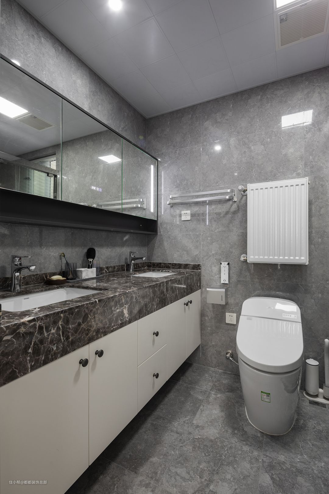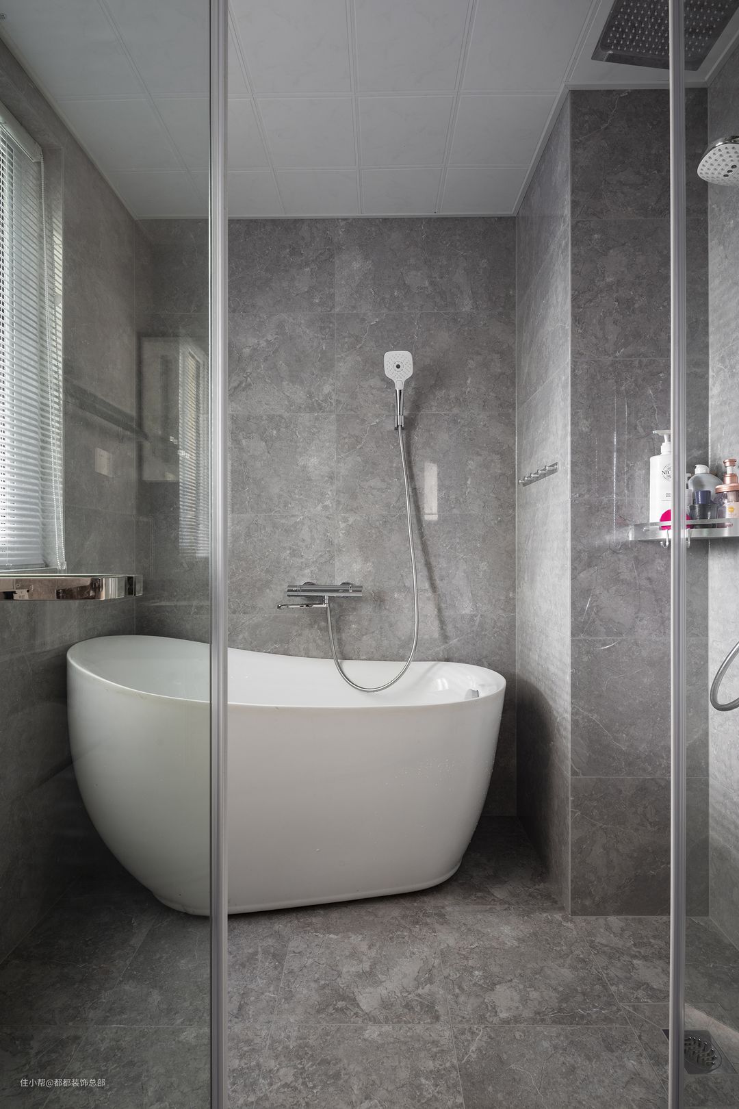 卫生间做了干湿分离处理,灰色仿大理石地砖是个性与低调奢华的碰撞,典雅浪漫的浴缸则是享受生活的证明,在狂飙突进的生活里给自己一个放松身心的角落。#晒晒你家的卫生间