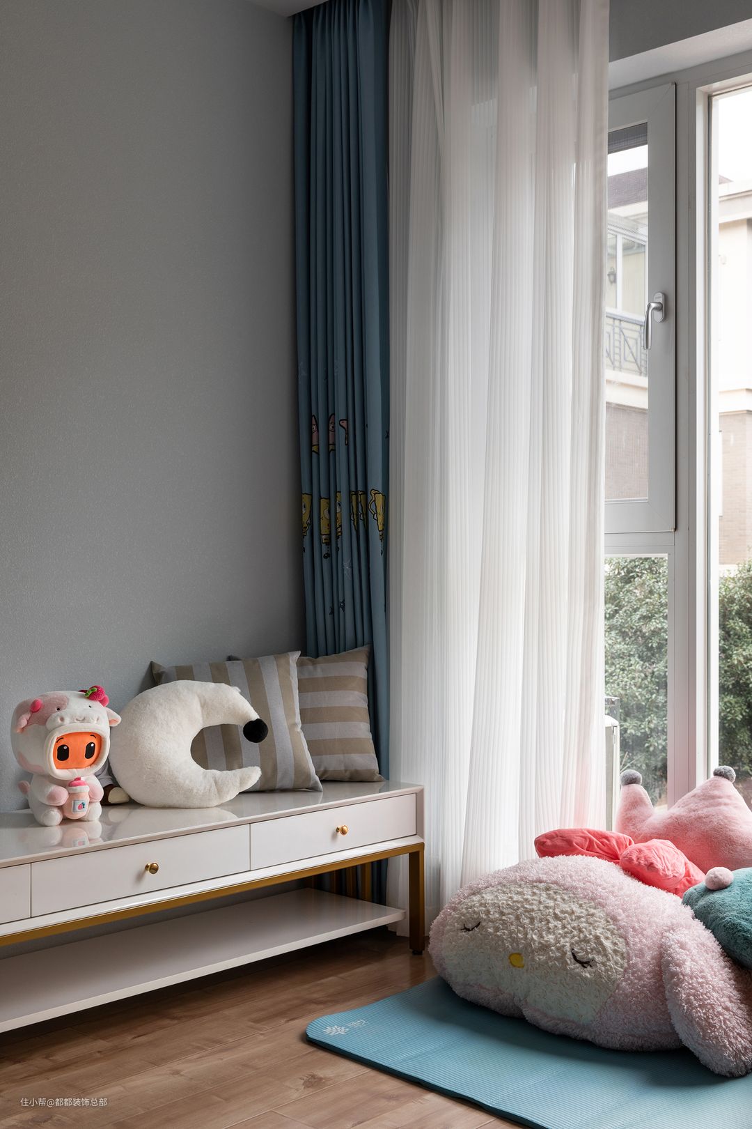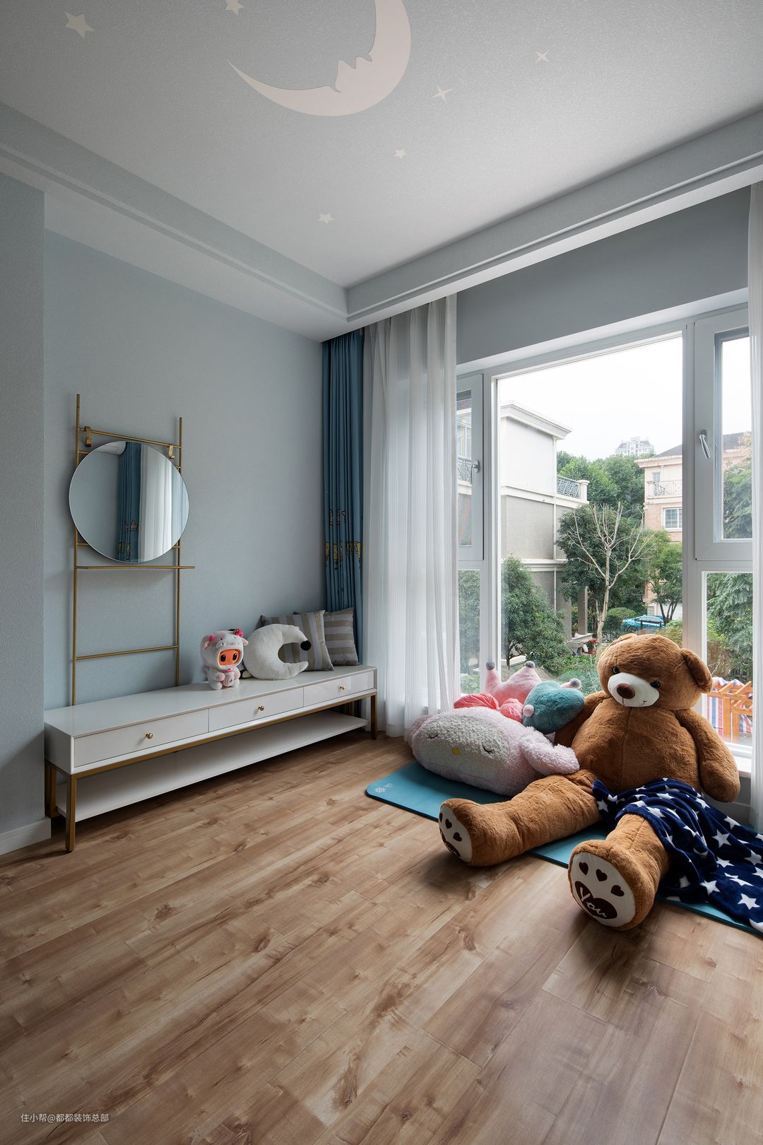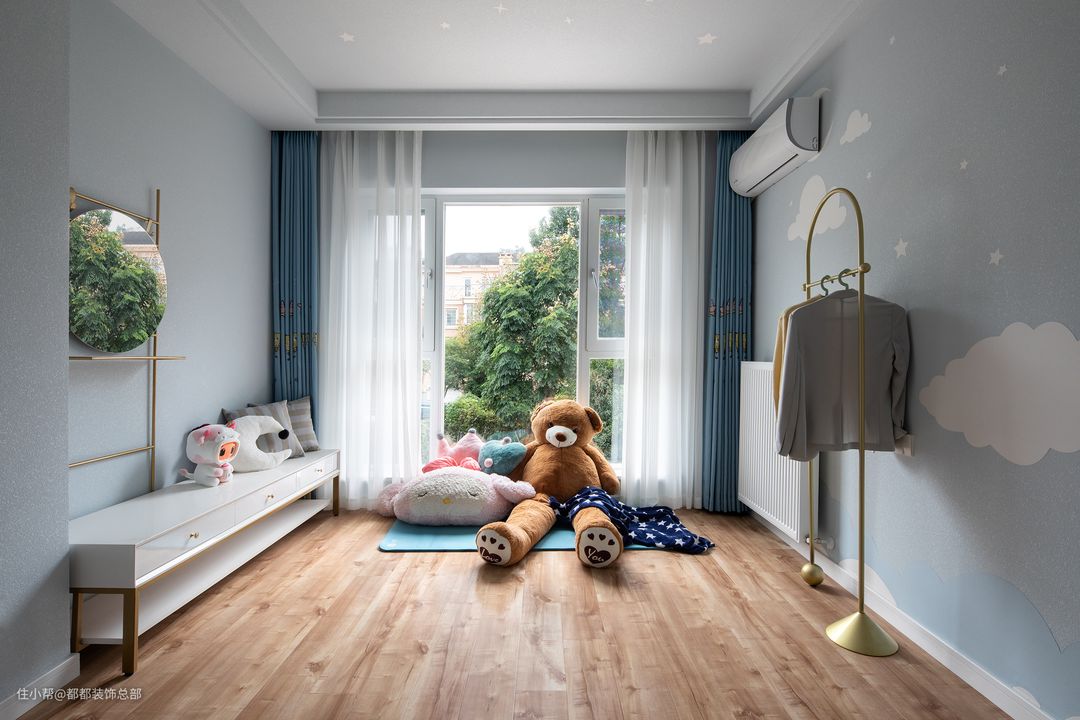 虽然业主是单身,但提前预留了儿童房,宽敞明亮,整体色调以蓝色系为主,简单的云朵图案增添了几分童趣,营造出舒适放松的空间氛围。#晒晒你家的儿童房