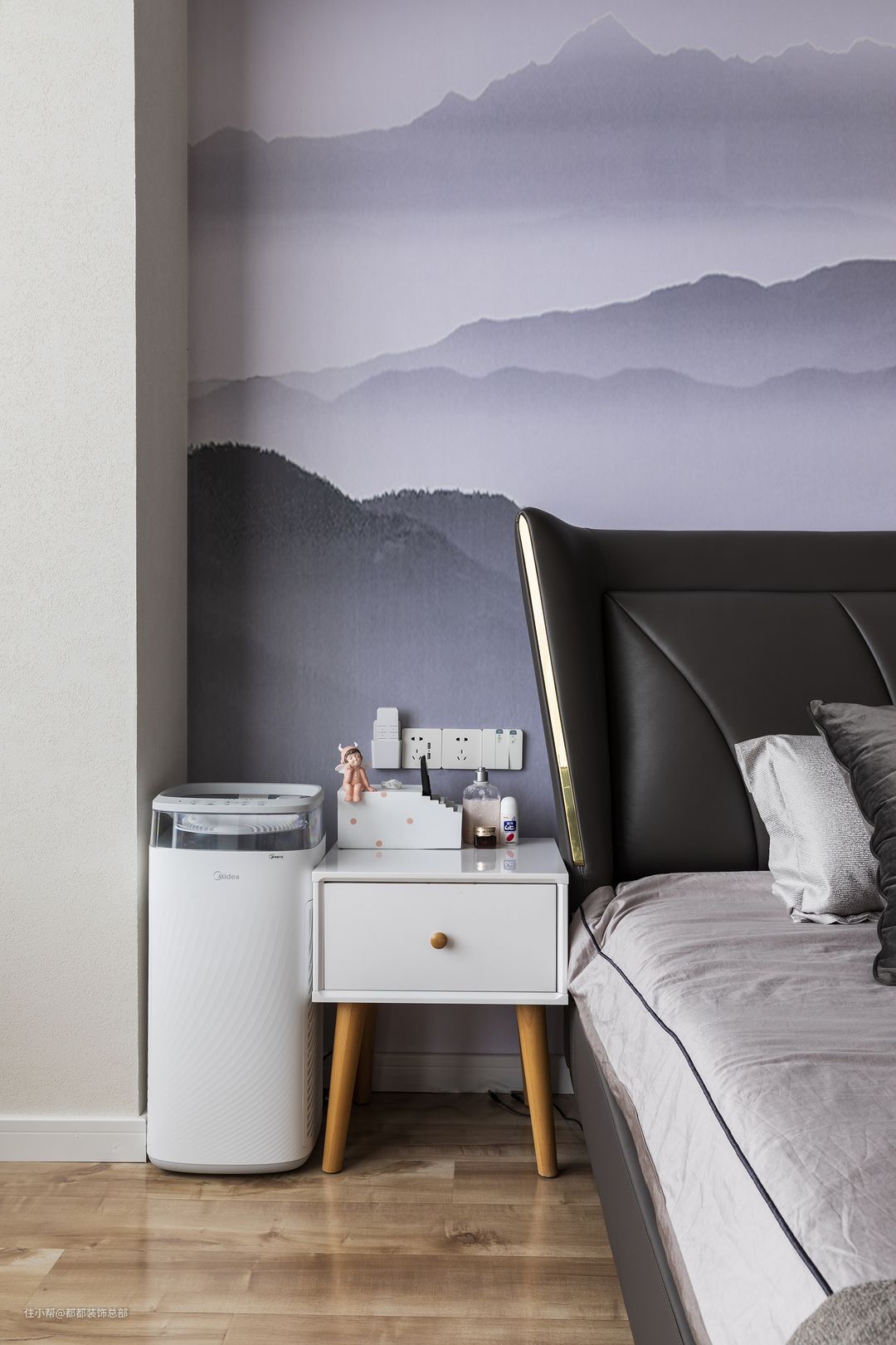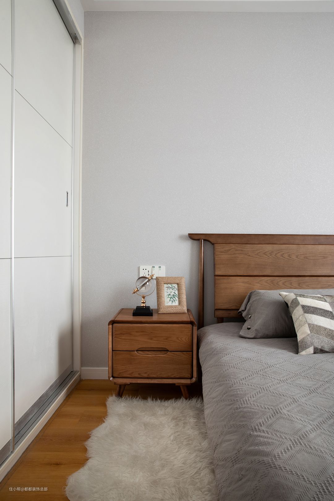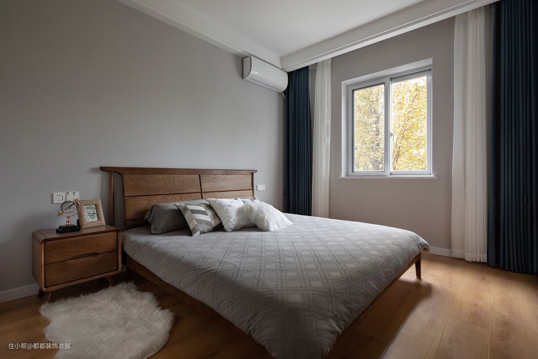 次卧为老人房,整体装修去繁留简,简约淳朴,整体色调选择了让人放松的张蓝色和白灰,清雅素净,再配上沉稳的木质地板,令空间散发出自然之美。#怎么提升房间颜值