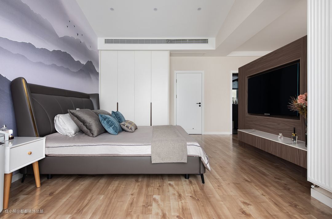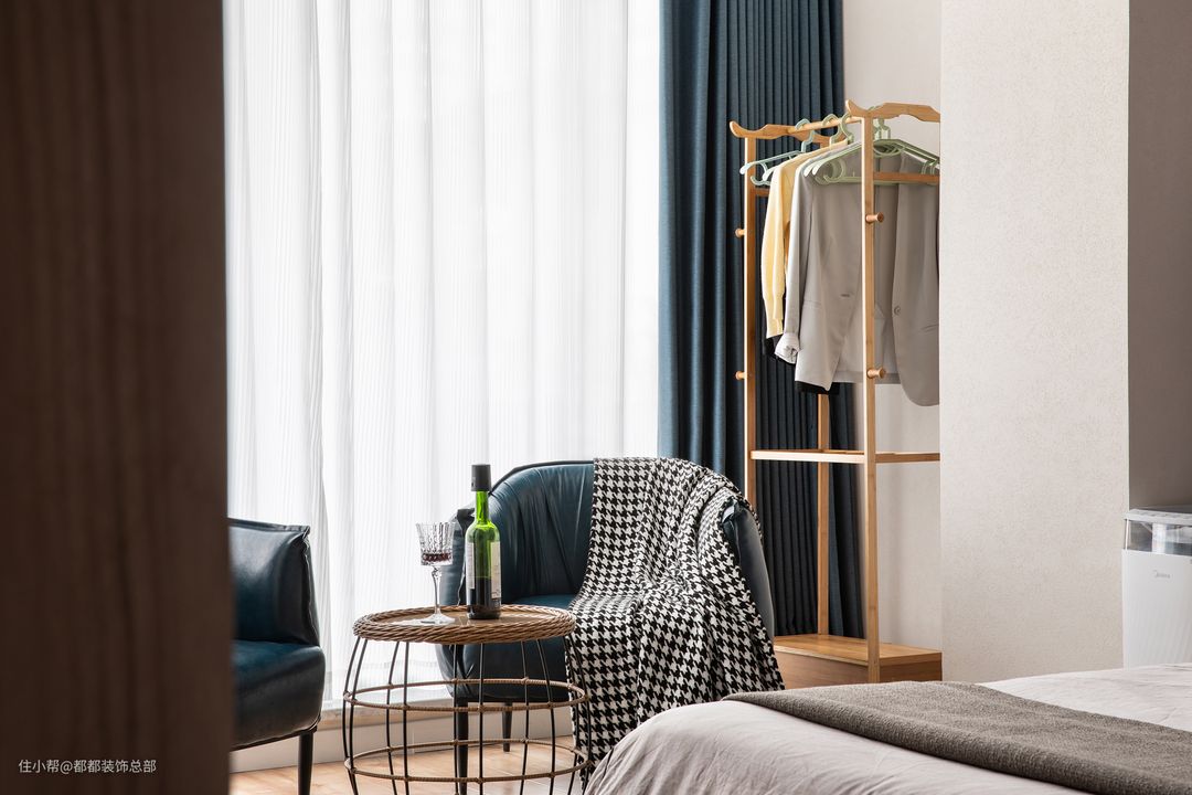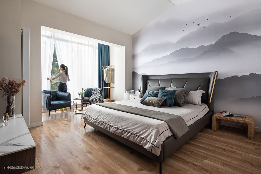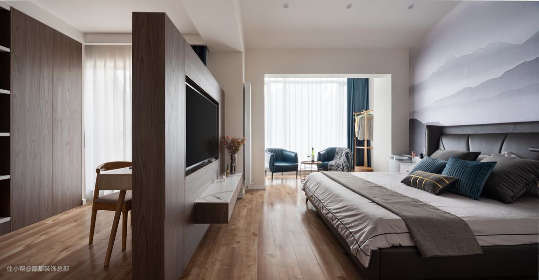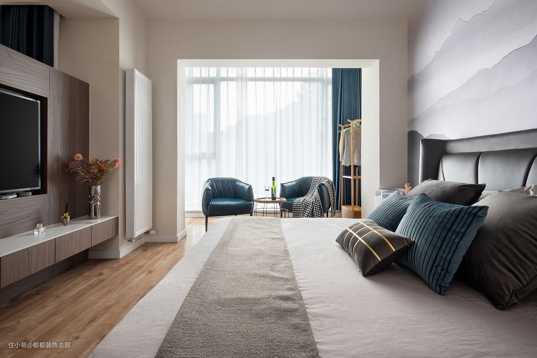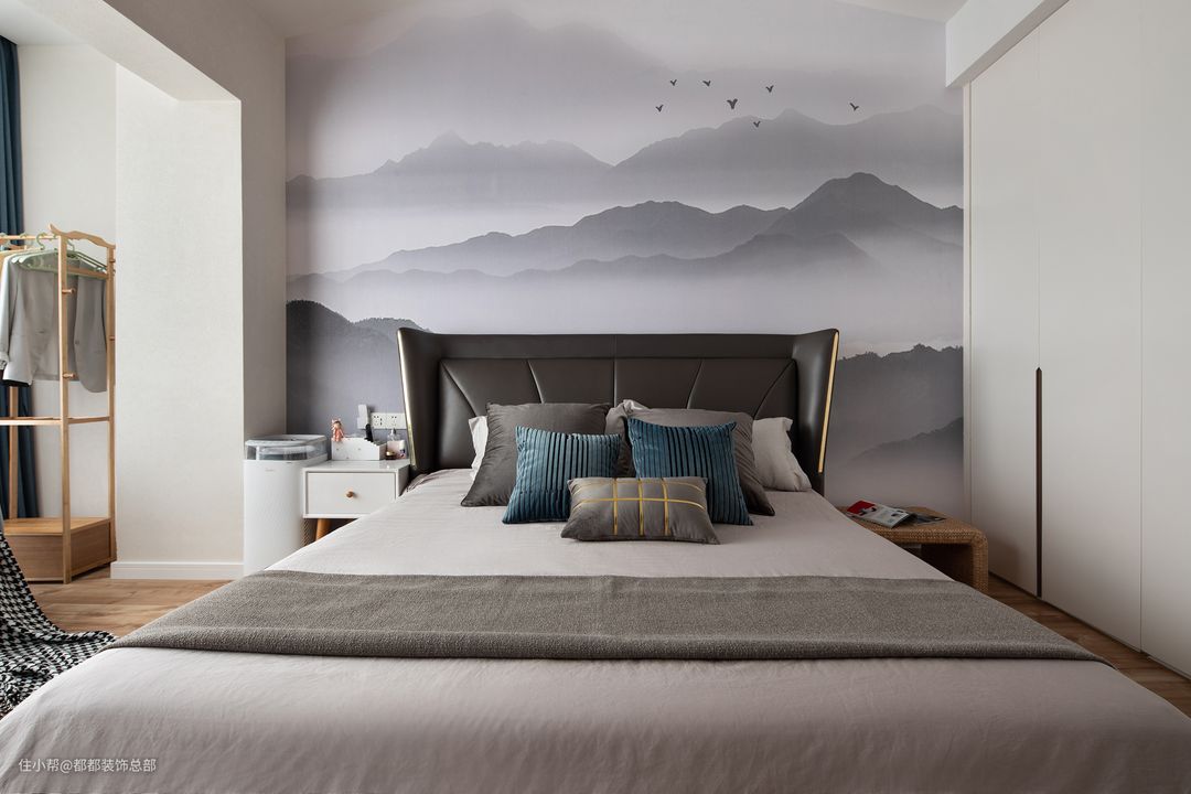 深浅不一,张弛有度的高级灰调从床上蔓延开来,传递出高级宁静的居室氛围,莫兰迪蓝色抱枕、窗帘、沙发穿插其中,给予空间浪漫的生活情调。#如果你也喜欢现代风格