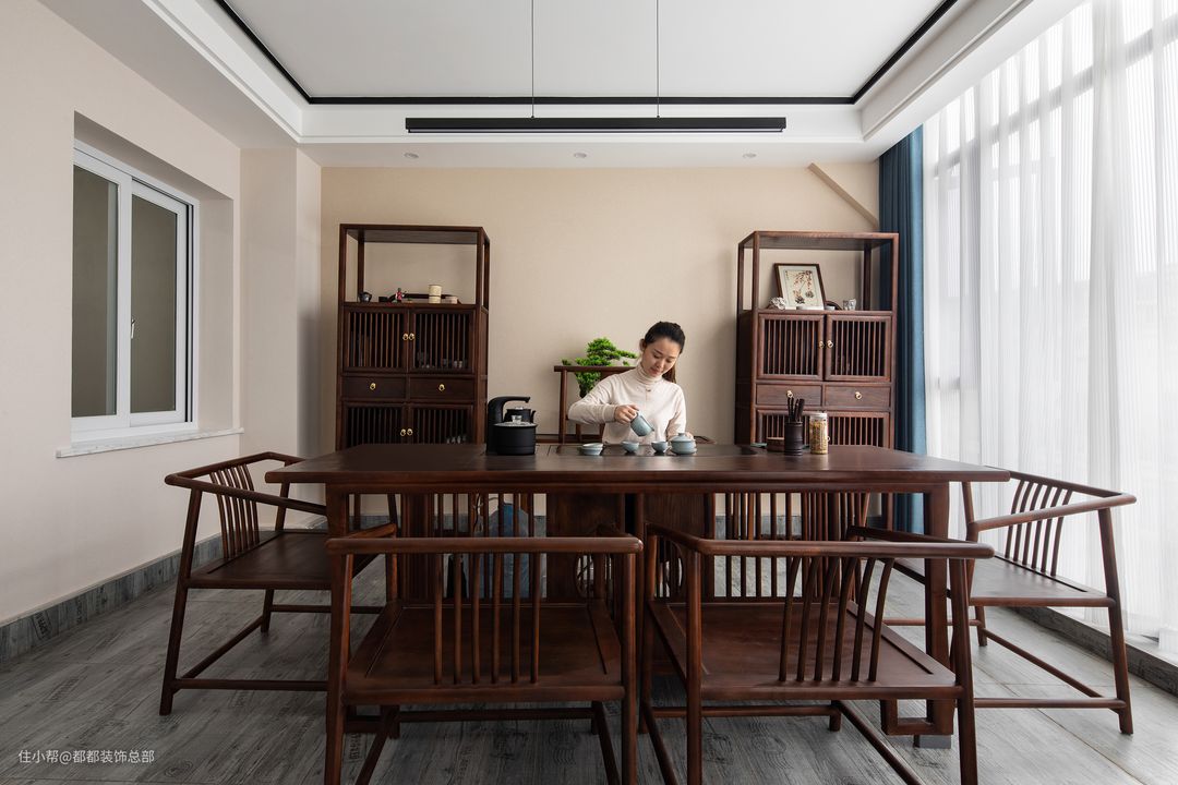 不论是独自,还是与三五朋友相聚,饮茶听雨都别有趣味。原本空闲的露台,设计师加顶规划成了茶室,柔和色调的墙面有着粗糙质感的肌理,实木茶桌沉稳大气,刚中带柔,整个空间弥漫着佛道的禅意。#藏在家装里的高级感