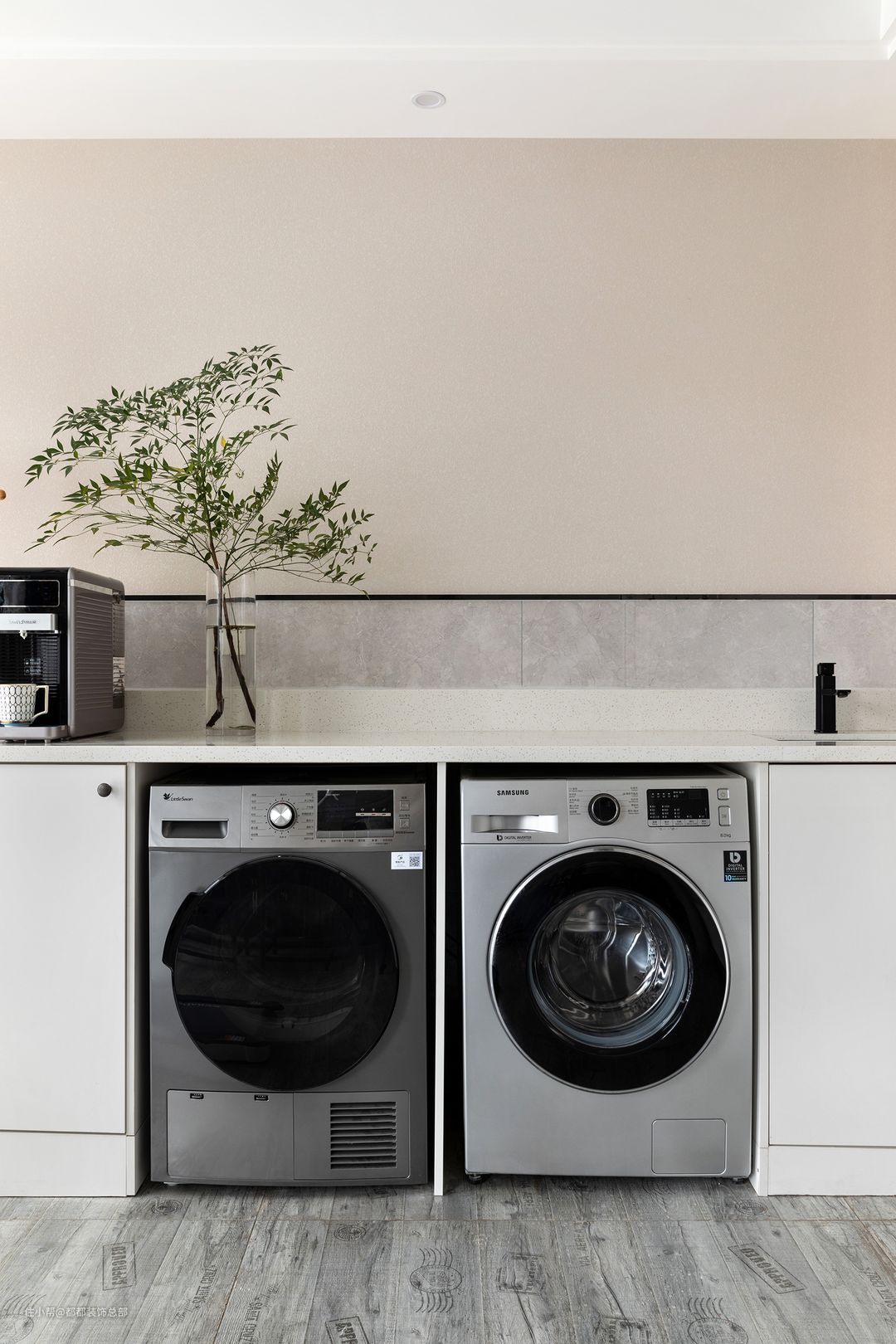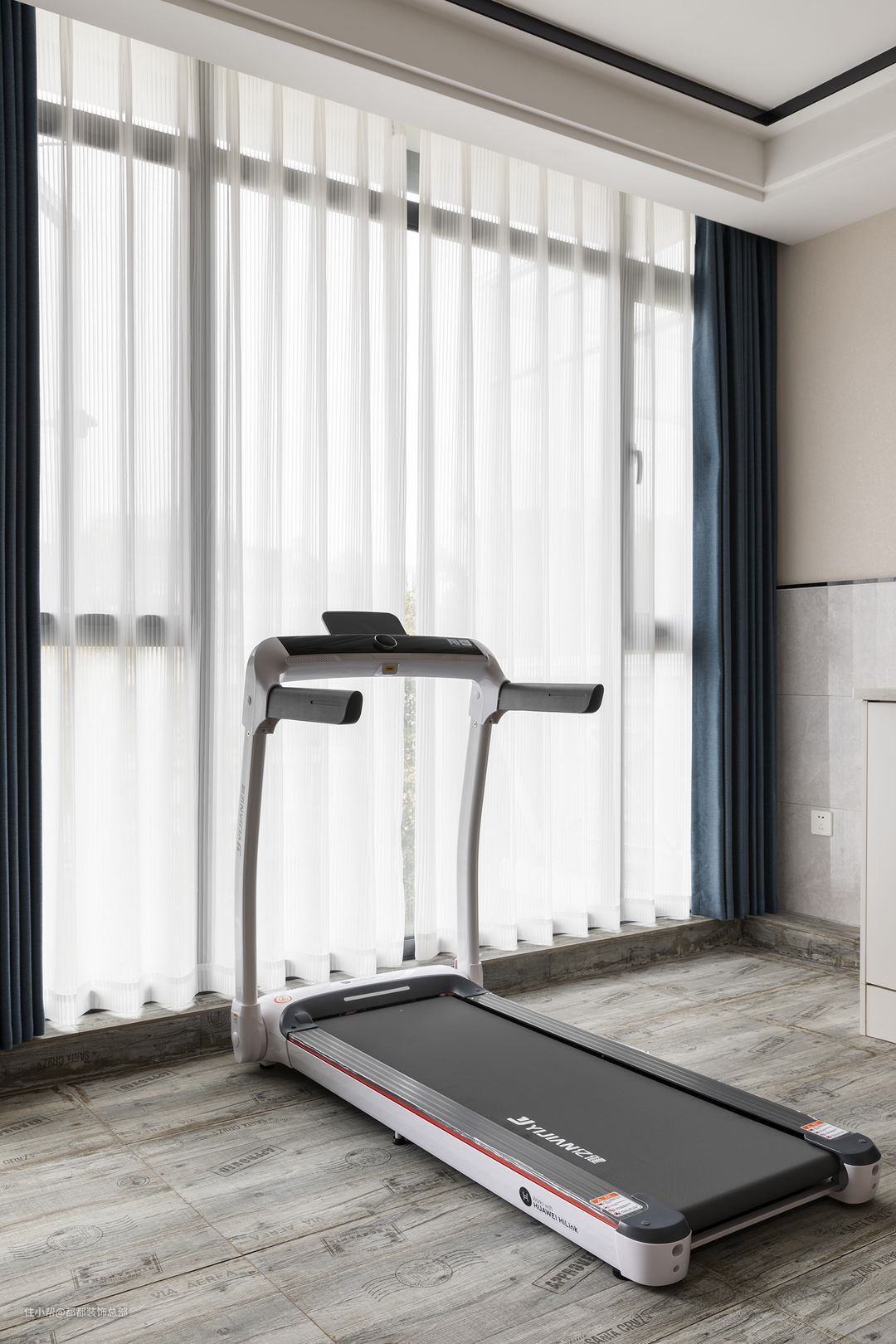 白色储物柜承包了阳台区域的收纳需求,底部预留空间,嵌进了洗烘机,洗晒功能全部得到实现,一台跑步机让生活习惯更健康。#阳台施工经验大全