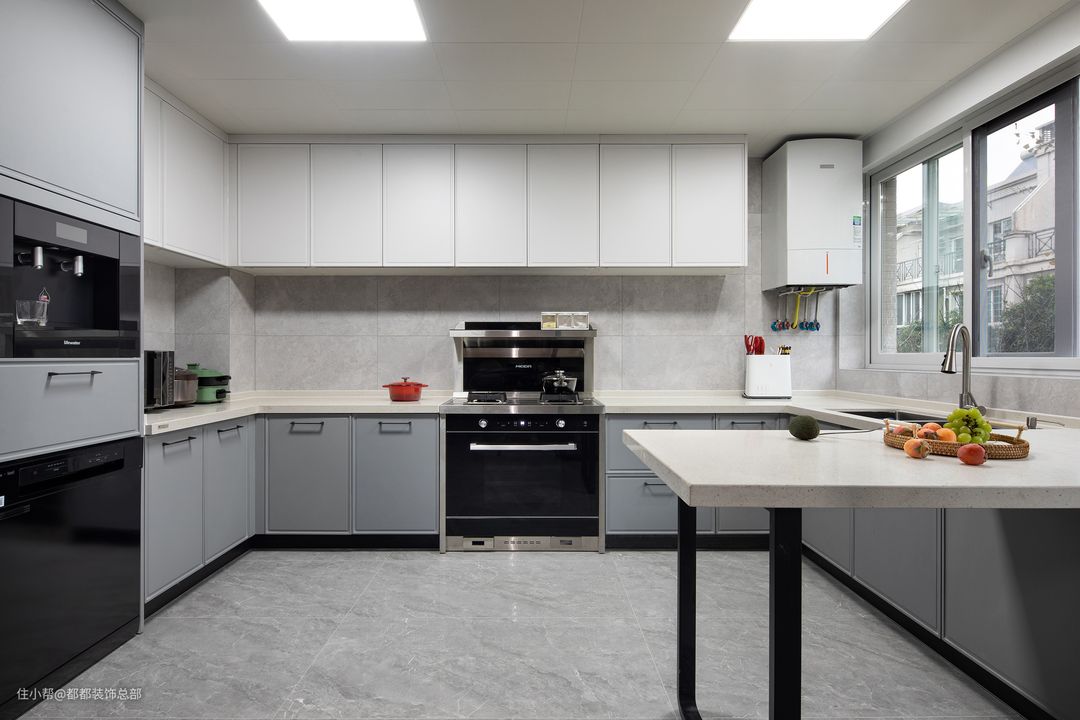 整体白色开放式厨房,橱柜顶天立地,嵌入各种电器,与白色墙体融合在一起,视觉空间毫无压抑感,岛台的不仅可当做操作台,还可以用餐,简单大气。#你家厨房长啥样?
