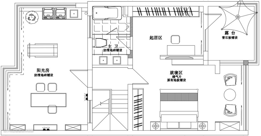 户型改造: 1、将厨房的阳台内包进来,开放式厨房使整体空间更宽敞明亮,增强互动性; 2、主卧阳台内包进来,规划出一个小型休闲区; 3、露台加顶,根据业主的生活习惯,规划出一个禅意十足的茶室。