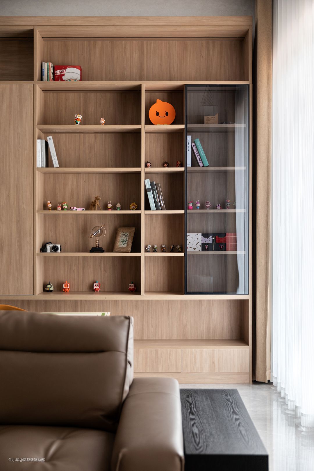 原木独特的肌理和温润的质感轻易演绎出温暖、沉稳、文艺的空间氛围;排列整齐的小摆件收藏了业主过去的时光岁月,温暖动人。