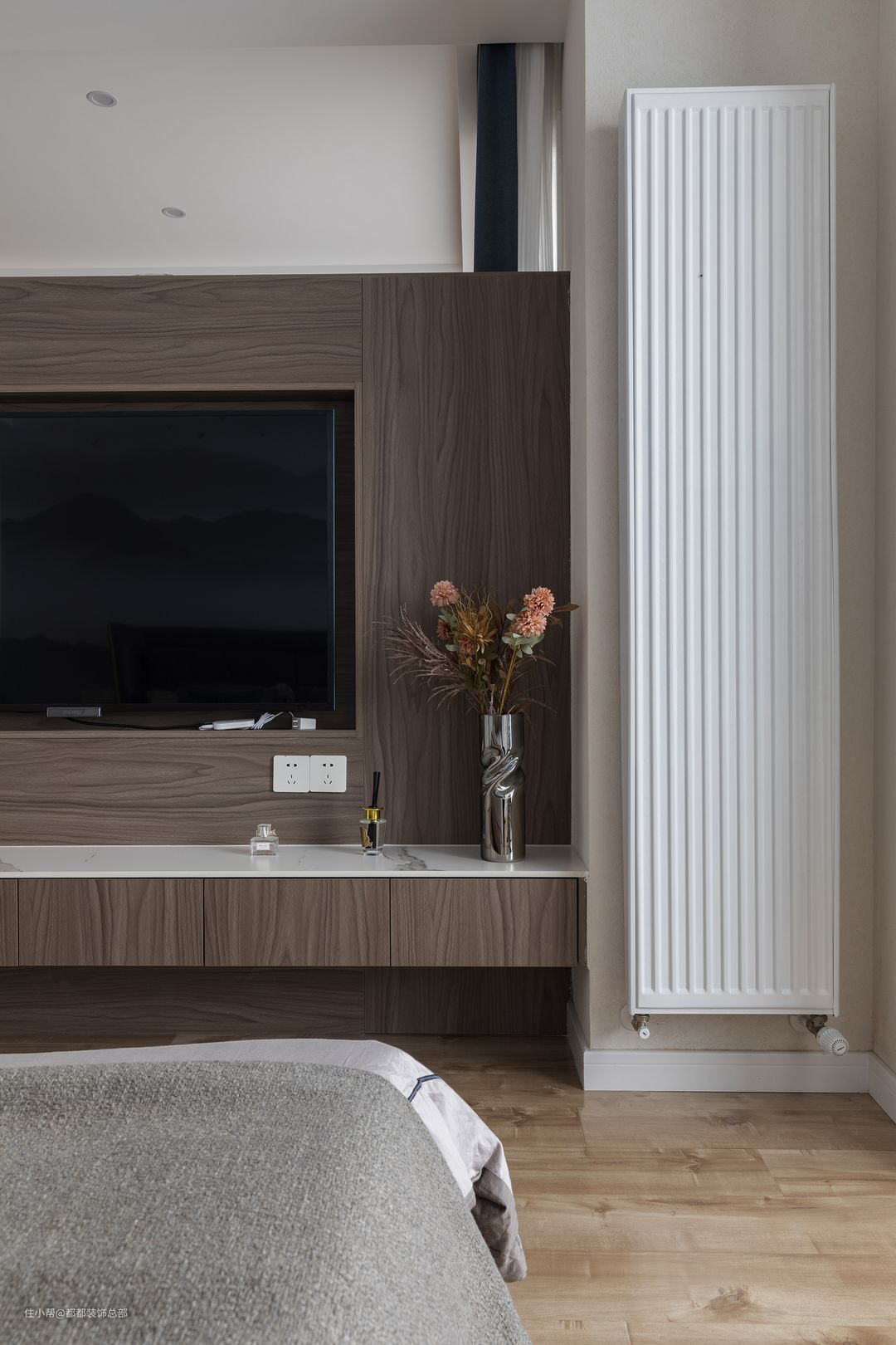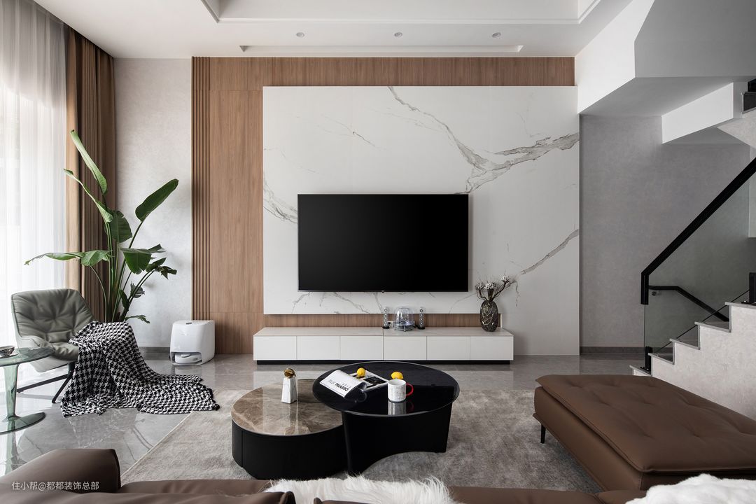 木饰面和大理石,温柔与冷冽,纯粹与厚重完美平衡了电视墙的整个空间秩序,给视觉以强烈的反差。#电视一定要放在客厅吗?