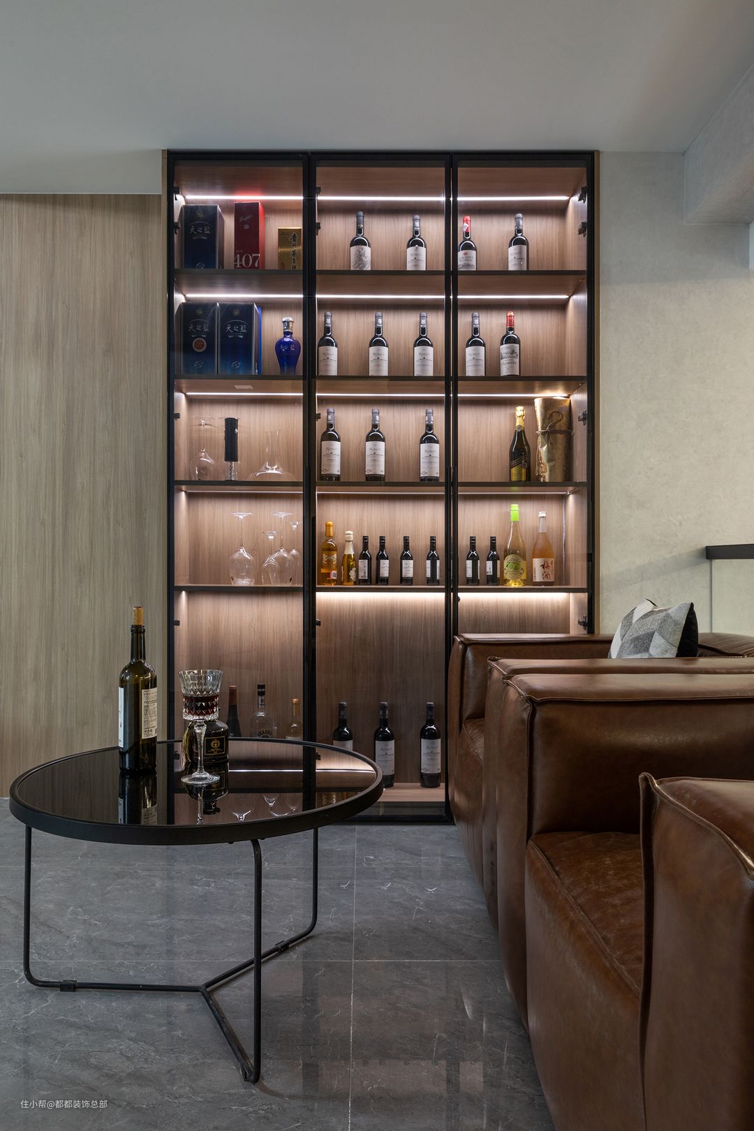 酒柜到顶,无把手掩门,酒格、玻璃门搭配通透明亮,内置灯条衬得酒柜更是精致,轻奢感十足。#晒晒你家的餐厅