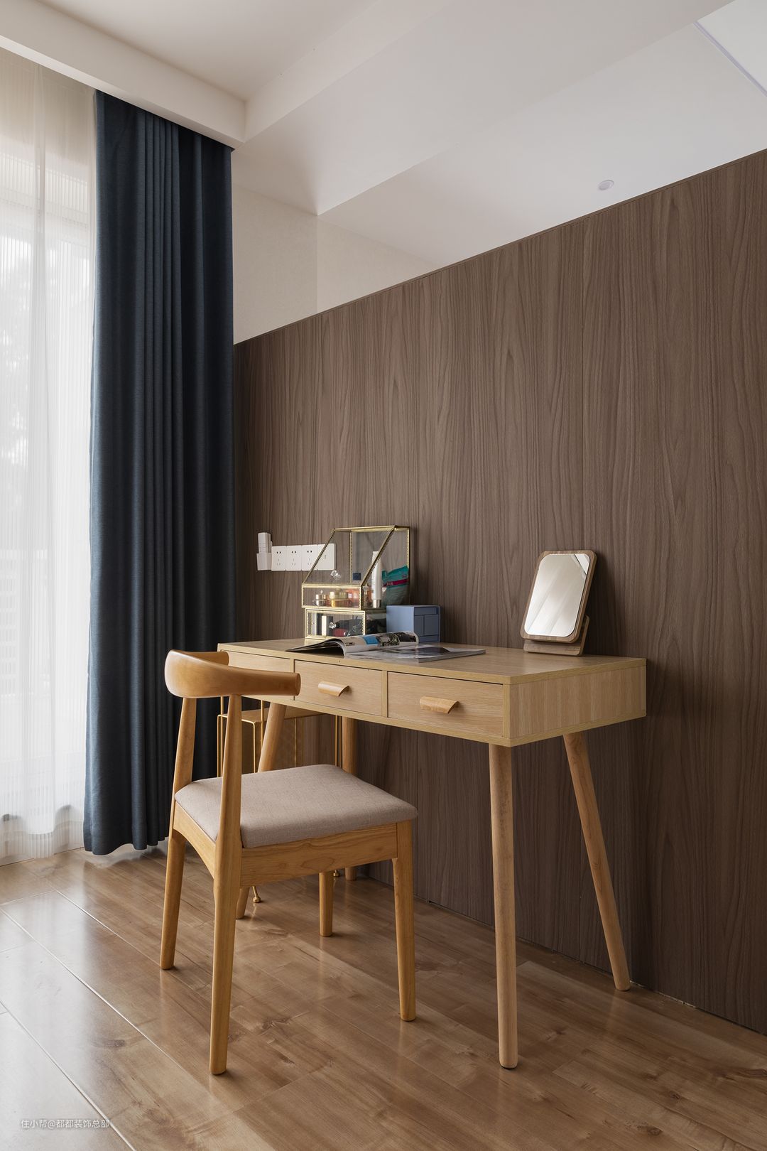 一堵实木背景墙成为了衣帽间和卧室的隔断,开放式的空间视觉上清爽大气,阳光从两扇落地窗外照进室内,更显得原木暖意十足。#晒晒你家的高颜值家具