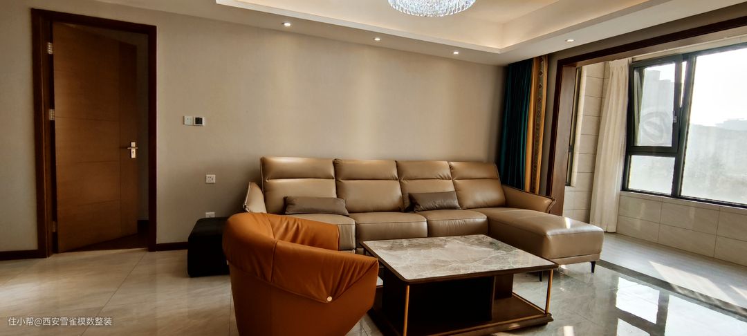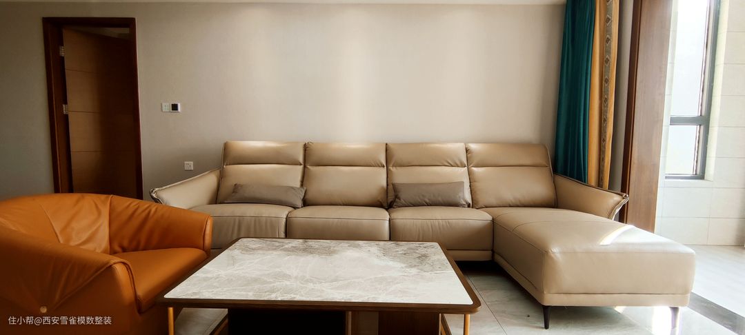 因为是一个正南的超大落地窗,所以在整体采光的感受上是非常的慵懒的。 而我们的设计师在软装的搭配上特别选用了橘色的点缀,让整个空间在层次上进行提升。