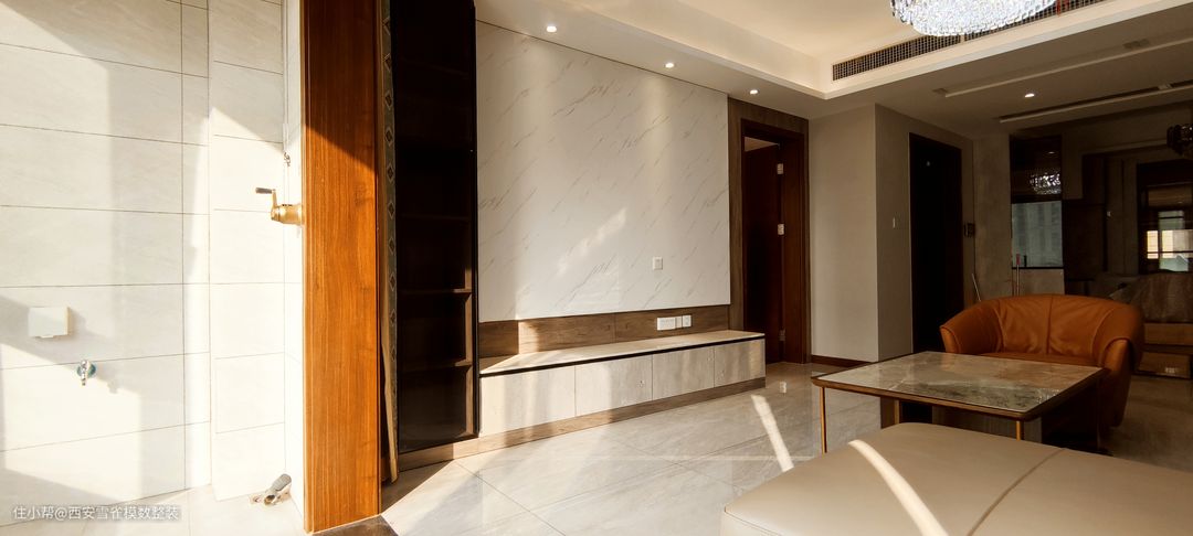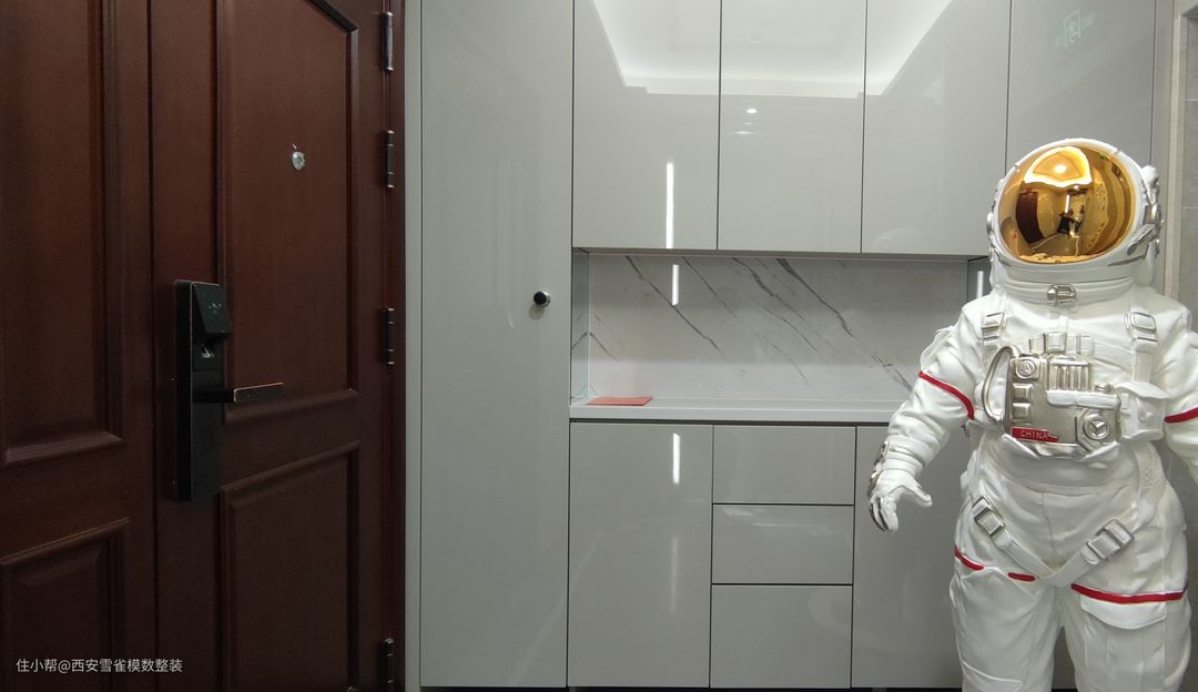 同时业主的儿子非常喜欢宇航员,我们的设计师通过各方渠道,为孩子弄来一个超大的宇航员摆件。 同时纯白的是柜体,让整个空间质感非常的高级,在昏暗的工区中,通过简单的灯光照射就可以折射出更多的空间节奏来。
