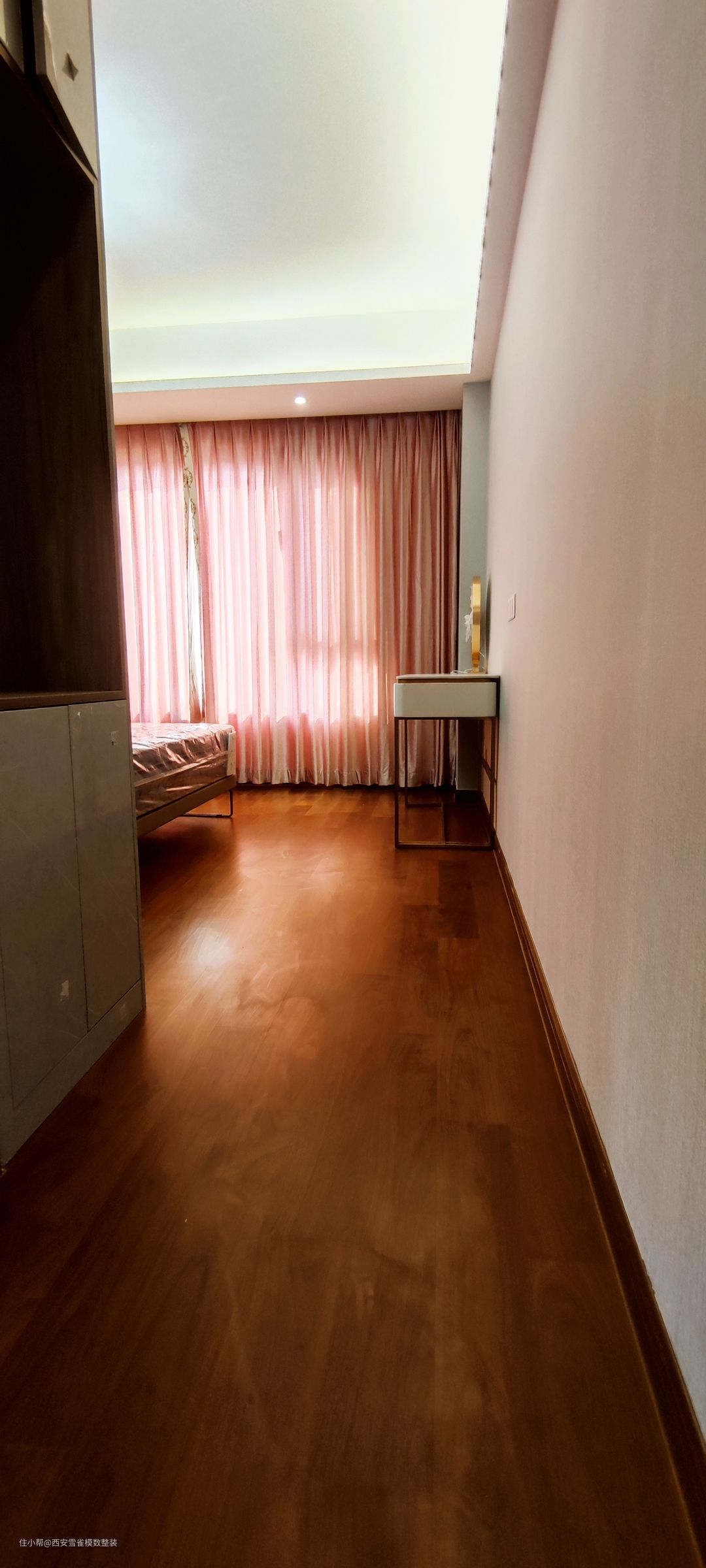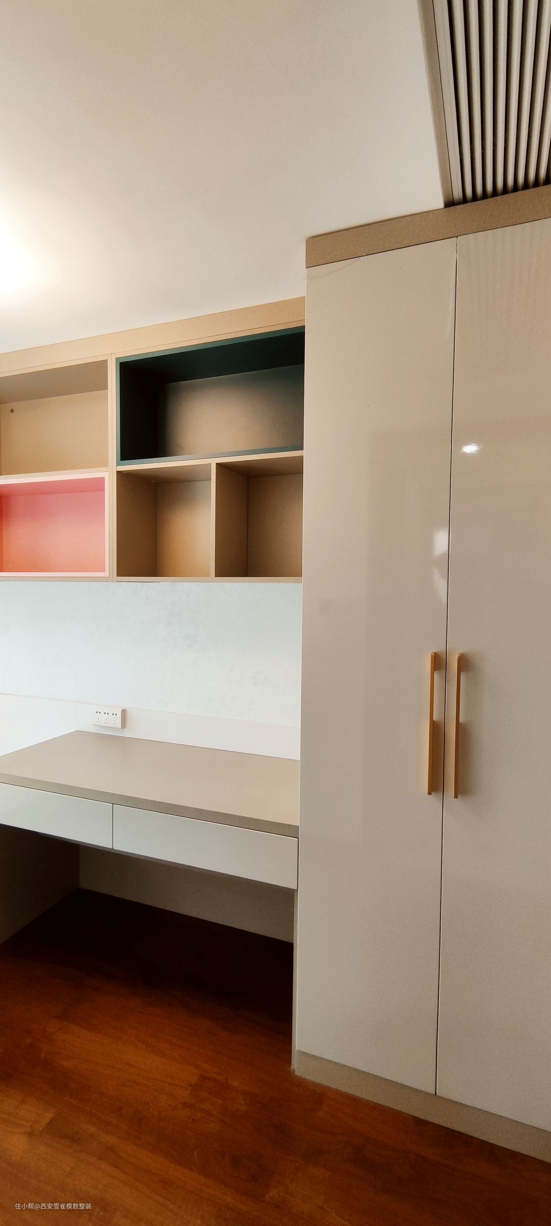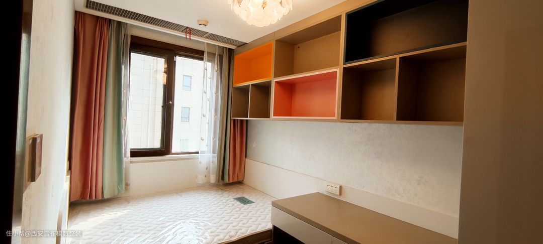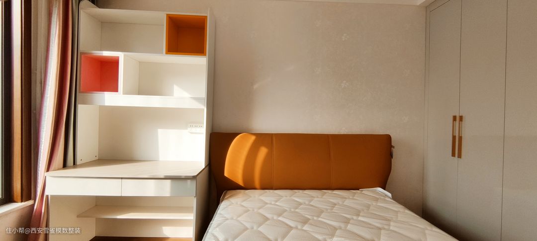 当时在于业主沟通的时候,客户对这件次卧的规划是给老人住的,但是在装修的过程中好事不断,业主夫人的肚子中又有新生命诞生了。 所以这间次卧中的书写一体柜是我们设计师为了庆祝小生命的诞生,拿多余出的板材自己打造的,业主也是非常的满意。