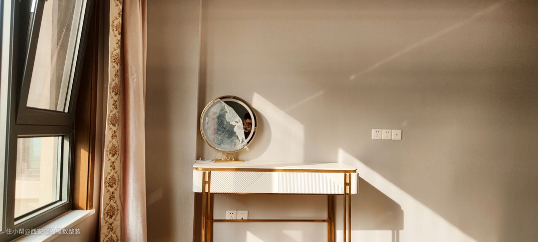 整个主卧最喜欢的就是这个梳妆台了,简单、大方配合阳光的照射,让整个空间质感得到质变。 同时配合采光,整体没有做太多的造型,让阳光洒满卧室是最精致的体验。
