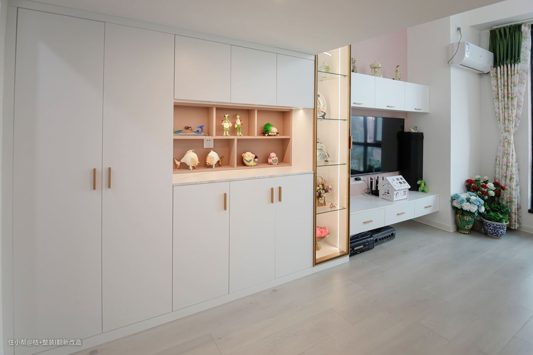 电视上方同样设置了3个收纳柜,没有做到顶的设计,摆上人物摆件,保持空间的活跃性,减少单调感。