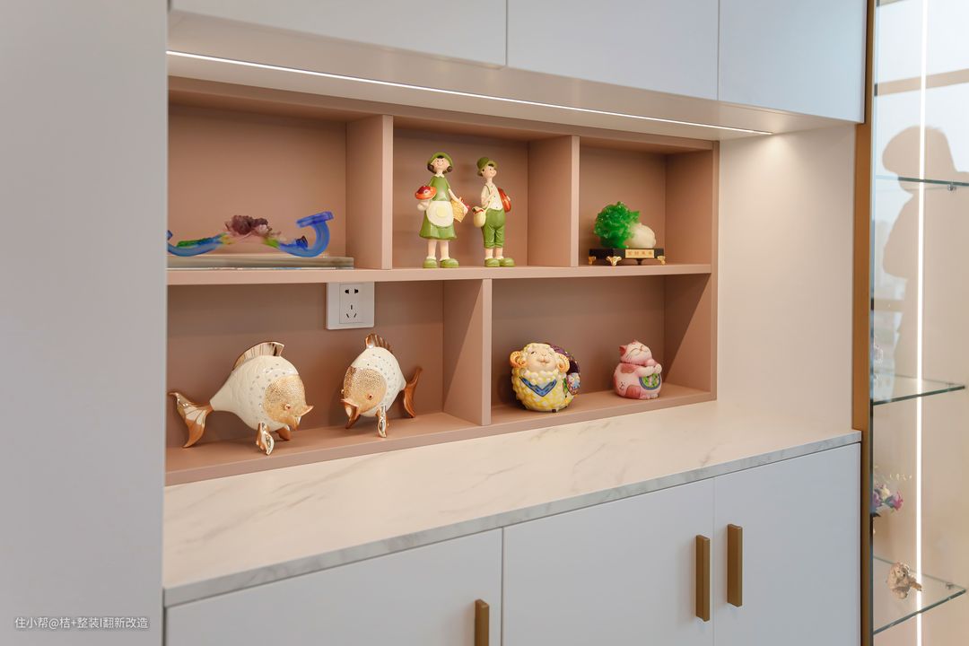 餐桌对面安排了整面墙的储物柜兼餐边柜,储物空间增大,足够满足父母平时的储物需求。 开放+封闭的组合,能储物,还能具有装饰作用,屋主给开放格配置一些形色各异的玩偶摆件,让这个空间多了一丝趣味与生机。