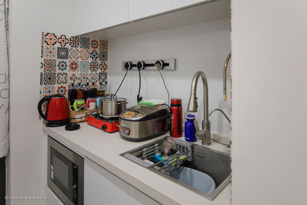 两边花色墙纸是专门的厨房防油贴纸哦~~具有装饰效果的同时还能防止油污!墙上挂了厨房自来水加热器,与卫生间加热水分离,互不干扰。