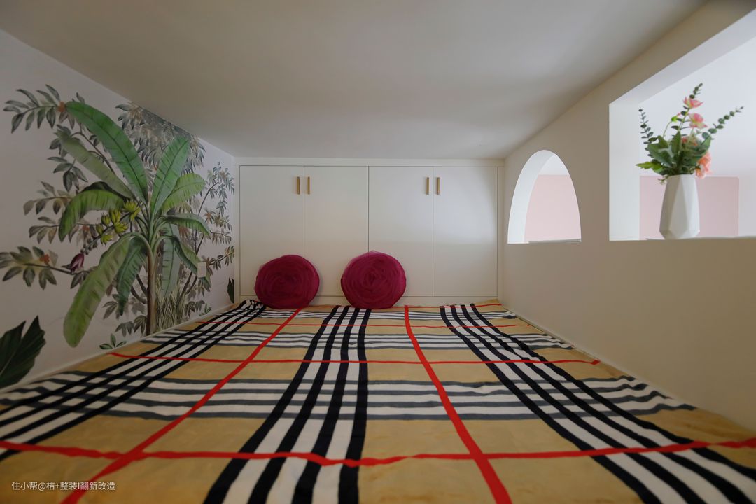床边做了一个半圆形的窗户、一个长方形的窗户,白天可以保证这里的采光不受影响。摆上两盆插画摆件,意境美便又多出了一分。