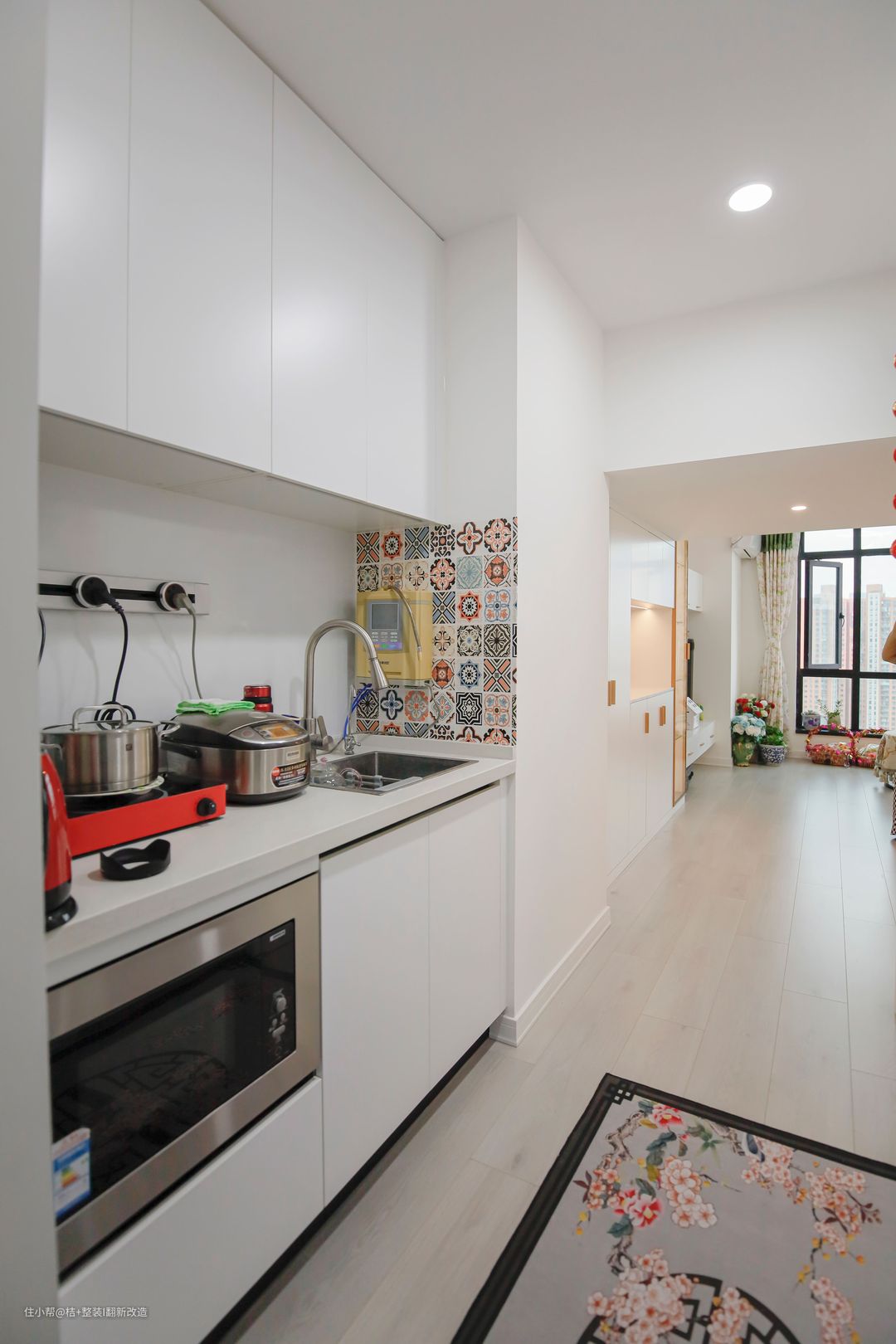 进门的左手边就是厨房,上下白色橱柜,下柜内嵌蒸烤箱一体机。选用可移动电源插座,移动电器用电方便灵活,有限的灶台空间可以灵活安排。一个大单槽洗碗槽,简单实用;抽拉式水龙头,清洁更加高效便捷。