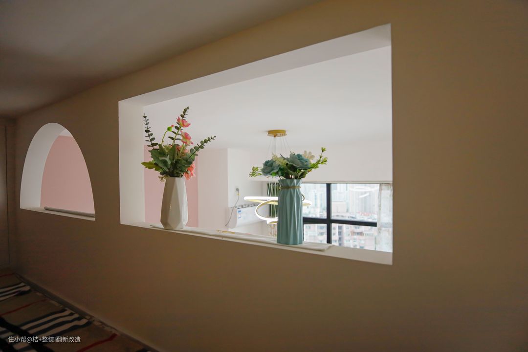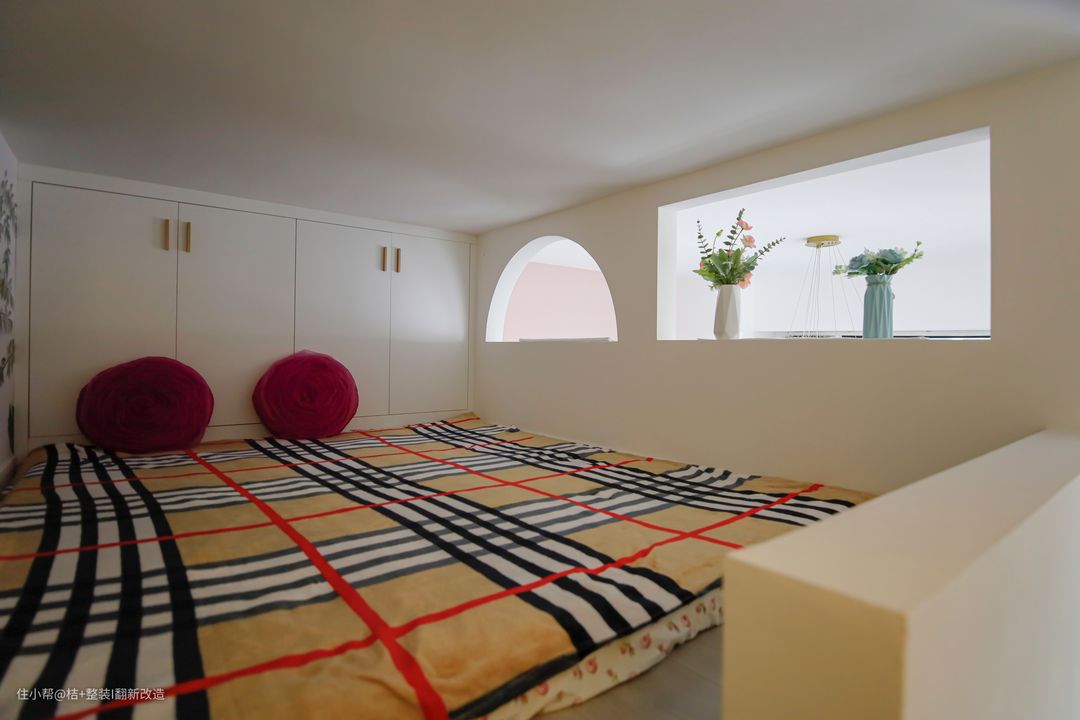 床边做了一个半圆形的窗户、一个长方形的窗户,白天可以保证这里的采光不受影响。摆上两盆插画摆件,意境美便又多出了一分。