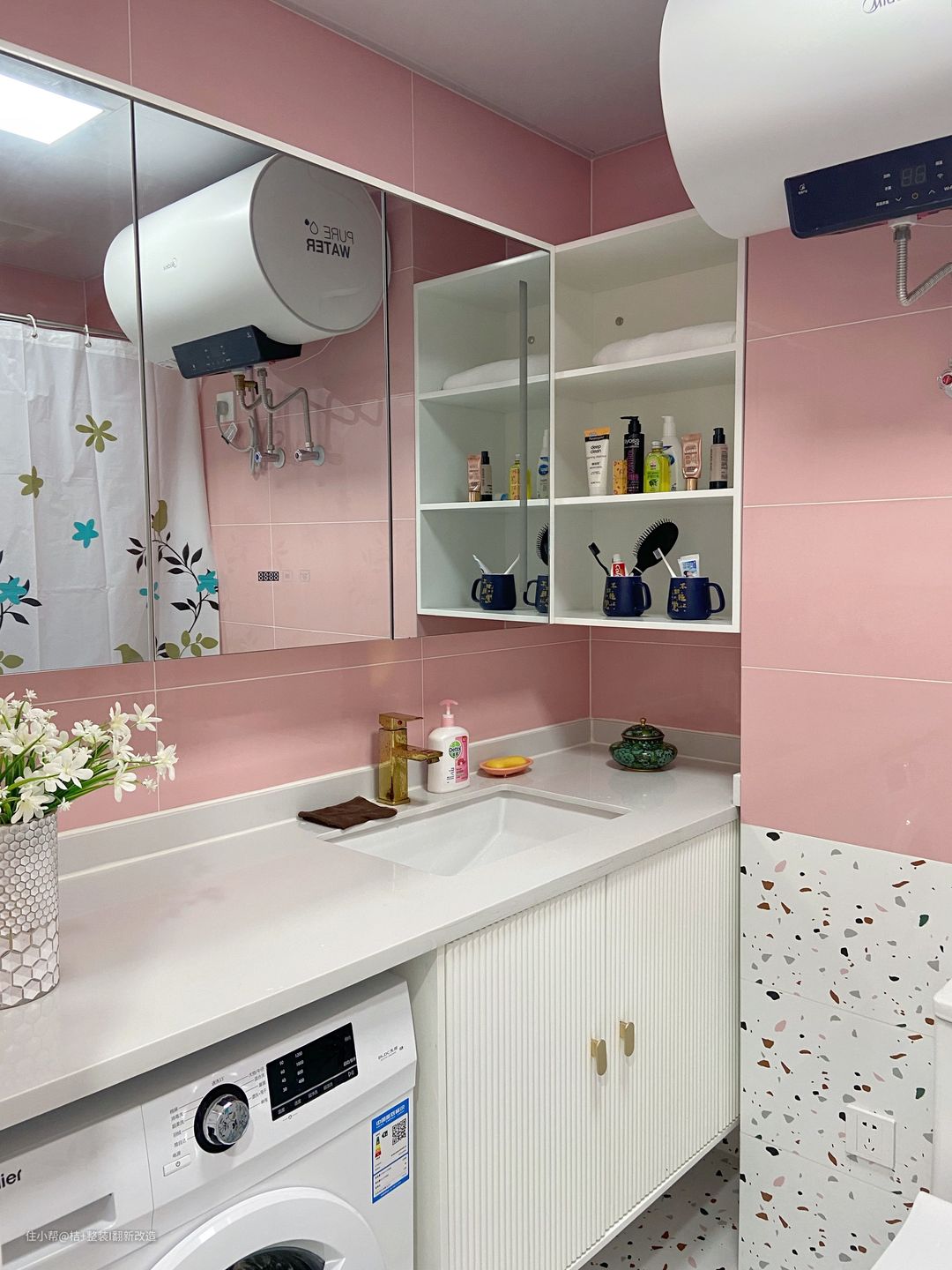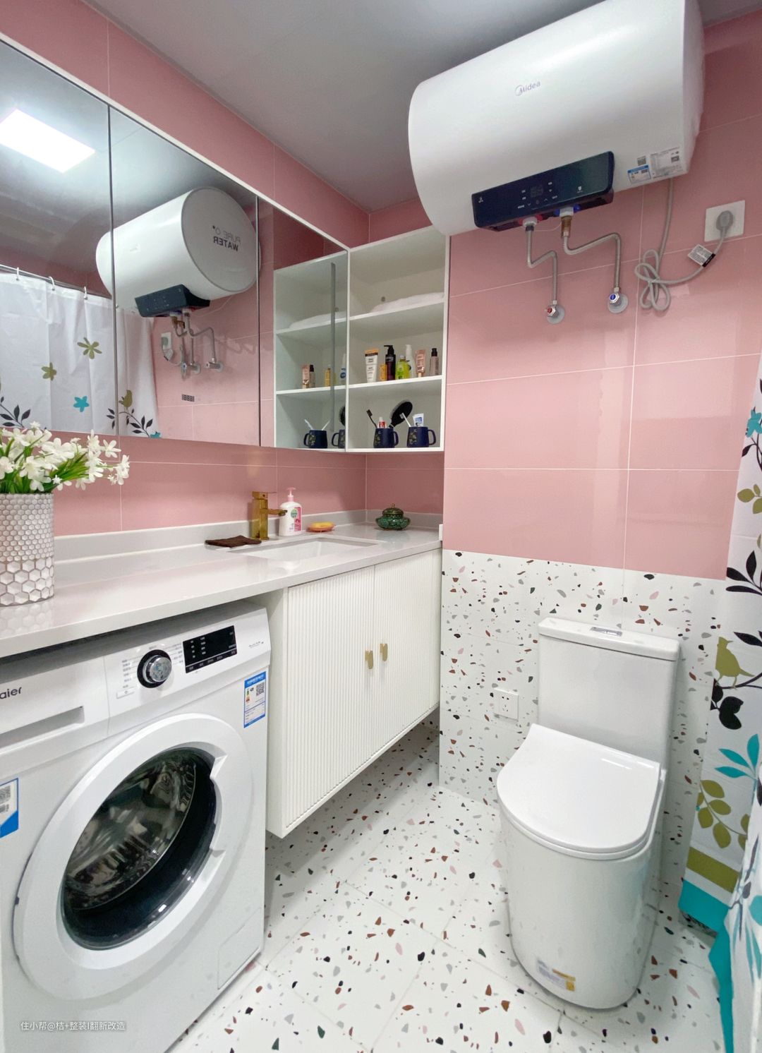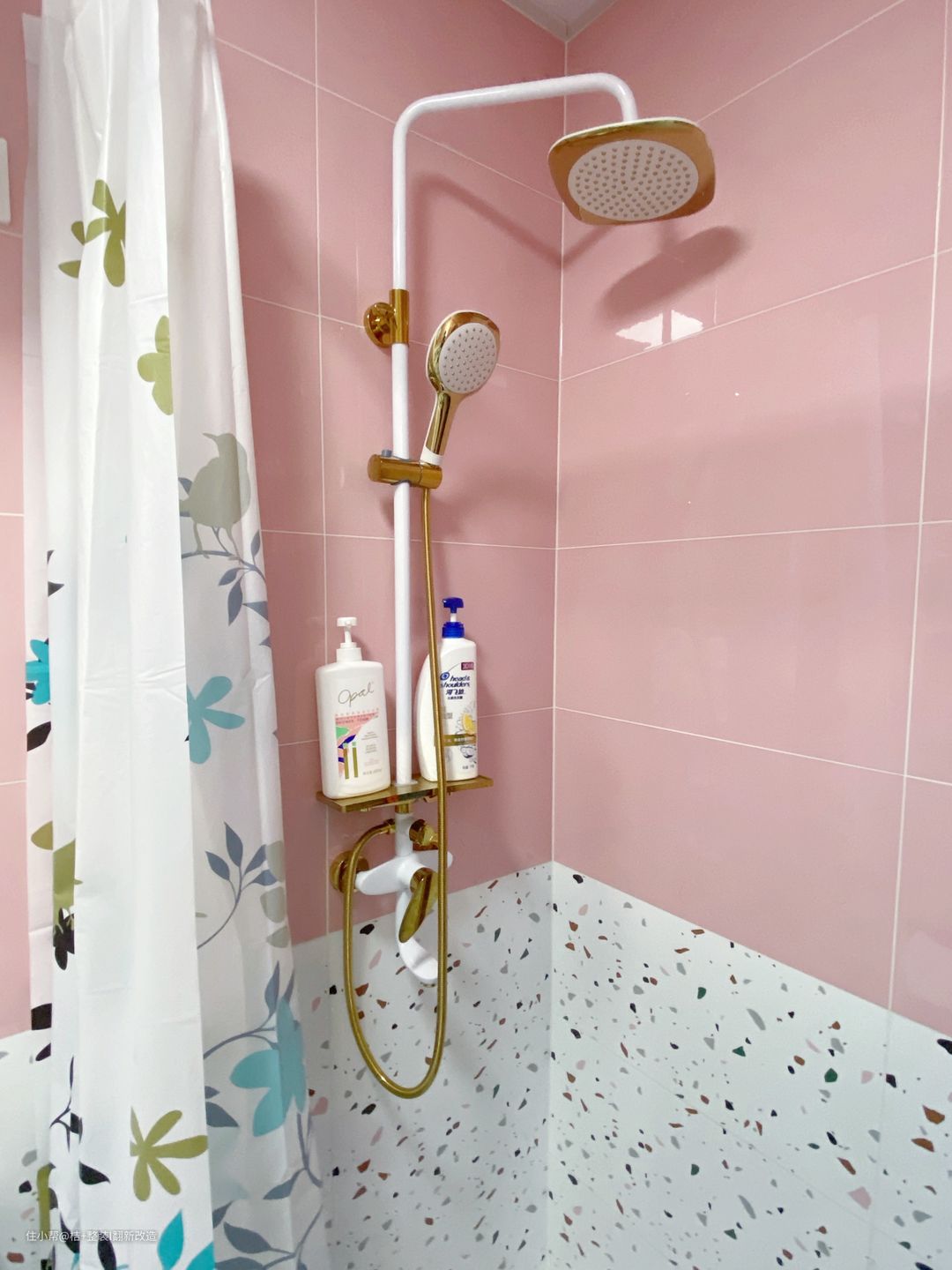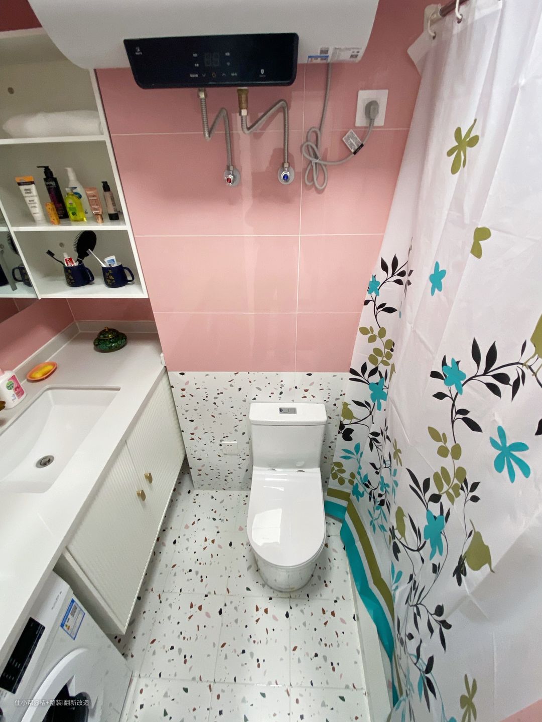卫生间内部以粉色和彩色水磨石瓷砖进行拼接设计,营造出了一种干净简约、轻松温柔的氛围。