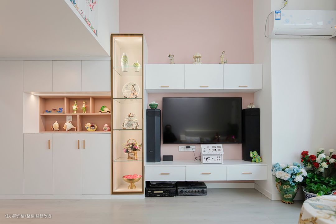 电视上方同样设置了3个收纳柜,没有做到顶的设计,摆上人物摆件,保持空间的活跃性,减少单调感。