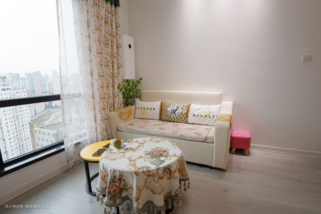 客厅选用了白色的双人布艺沙发,以及两个高低错落的木色茶几桌,茶几上简单铺上一方带有欧式风味的桌布,就能打造多变的客厅空间!