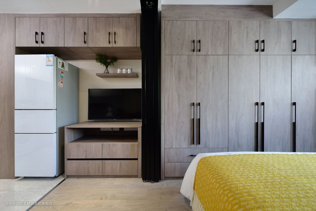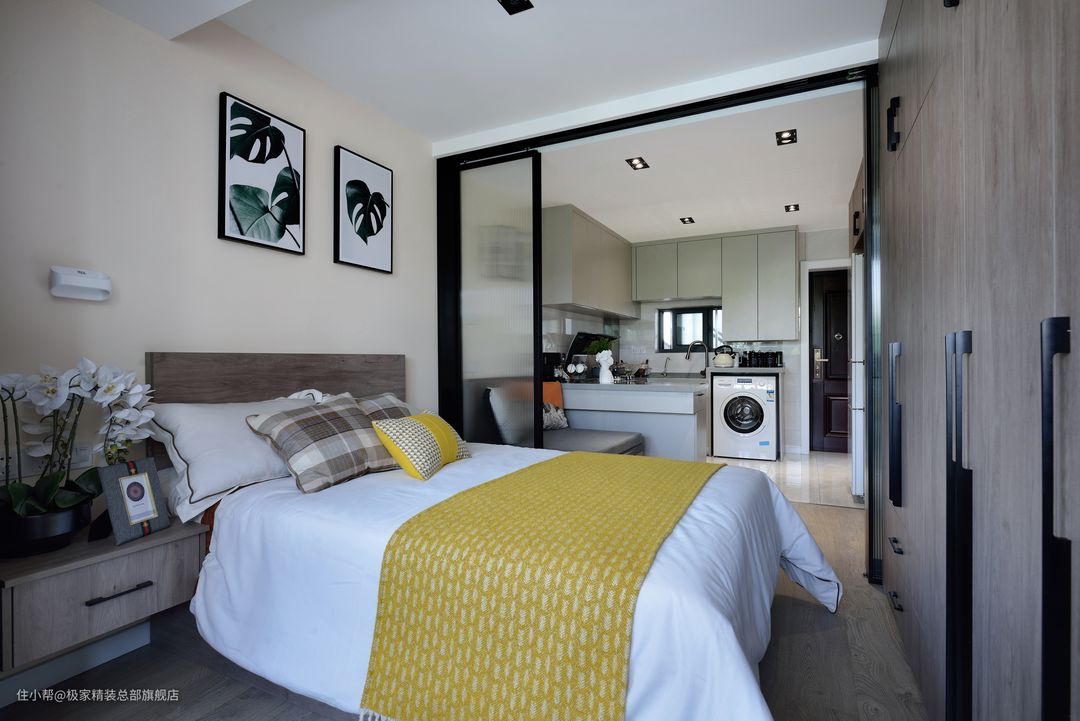 四联开的长虹玻璃隔断提高房间的透光性与私密性,并且也是很好的装饰。简单的设计不做繁杂设计,搭配通体的衣柜提高收纳,一字型设计在视觉上做“减法”。黑色与木质搭配沉稳低调伴随清新的挂画与绿植,给空间增添一份生活氛围!
